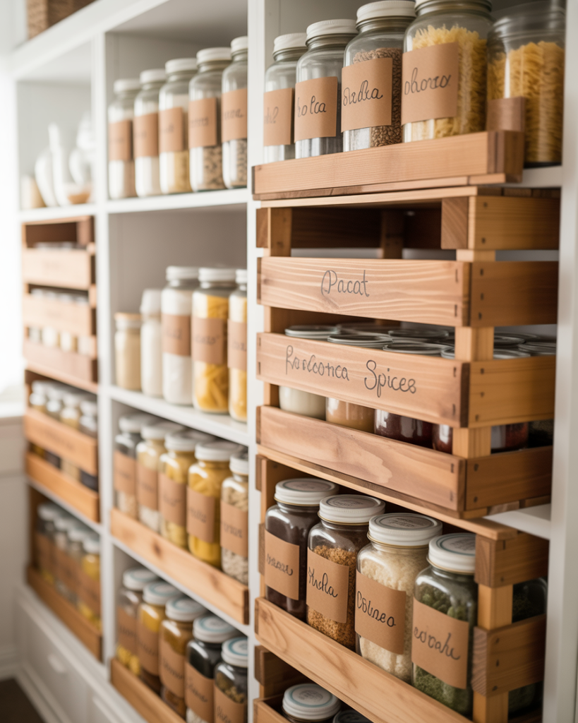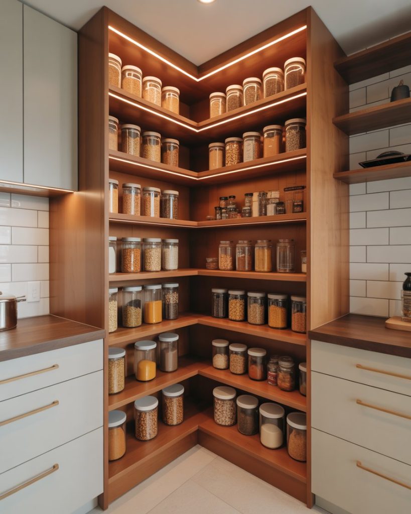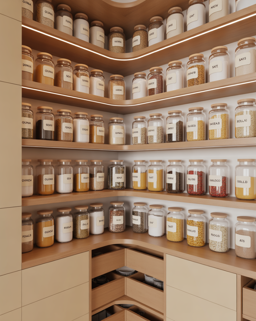 The overlooked corner of the room is becoming a pantry favorite thanks to wrap-around shelves that create instant visibility. Unlike deep closets where food disappears, this layout curves with your reach, making sauces, snacks, and pasta easy to grab. It also softens room geometry, which is why many remodelers choose it instead of another straight cabinet run.