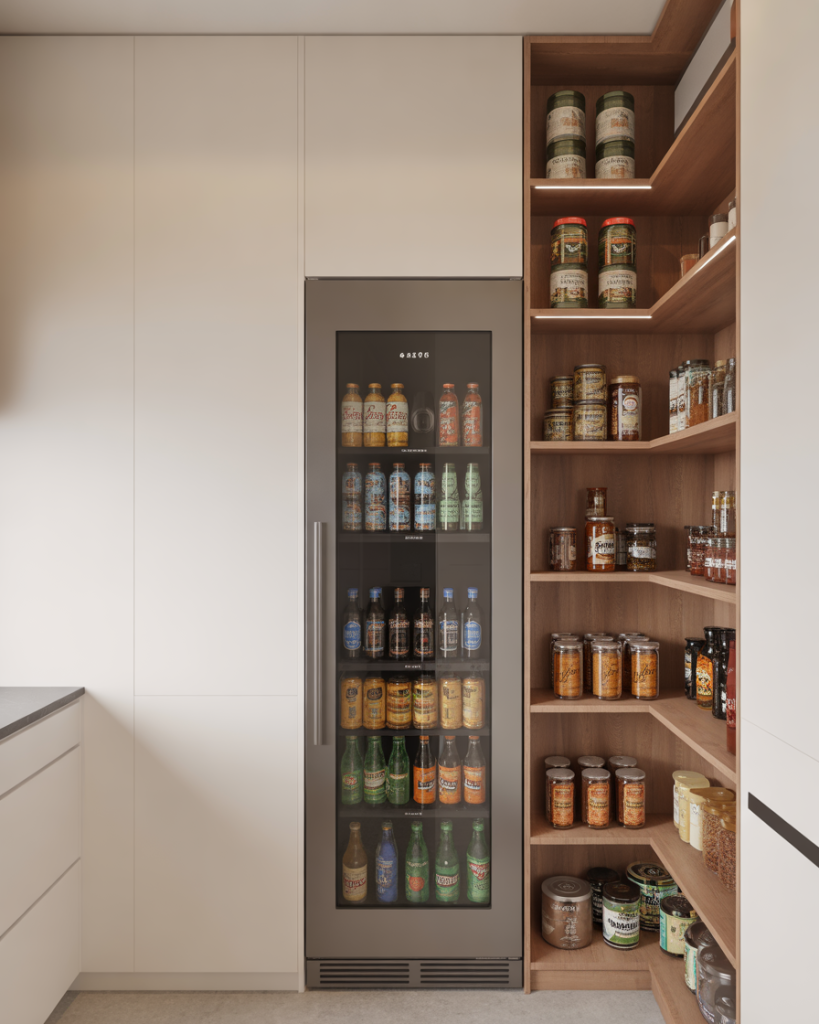 Instead of separating fridge and dry storage, some homeowners install a small beverage cooler or under-counter fridge directly in the pantry. This keeps drinks, produce, and snacks together, reducing traffic in the kitchen. It’s especially convenient for teenagers—or anyone who raids the pantry at midnight and doesn’t want a bright fridge light waking them up.