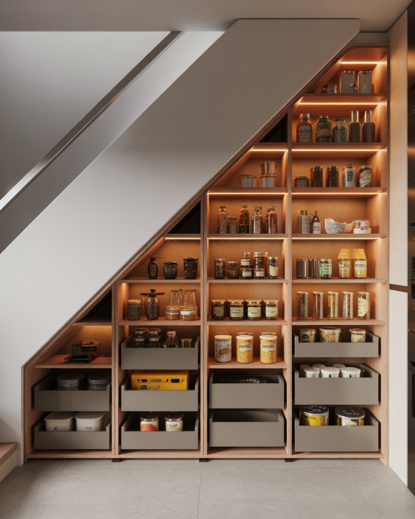What used to be a spot for holiday decor is now becoming a clever pantry, especially in two-story homes low on storage. Designers add recessed lighting, shallow shelves, and even spice drawers. It’s one of the smartest ideas for small kitchens because it reclaims a forgotten part of the house without altering the main floor plan.