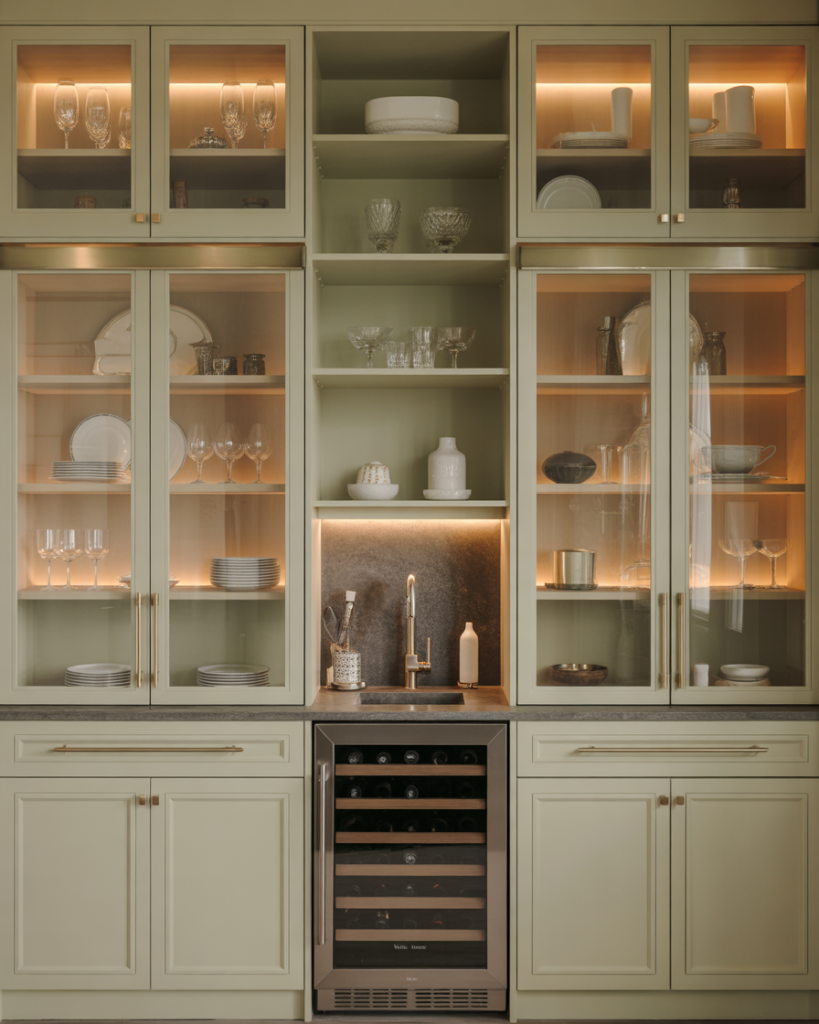 A butler pantry is the behind-the-scenes hero of dinner parties, holding glassware, wine, and those countertop appliances you’d rather not show. Designers love pairing closed cabinets with open shelves so the space feels functional but still styled. It lets you prep like a restaurant while keeping the main dining area calm, which is why entertainers call it “the stress-free hosting hack.