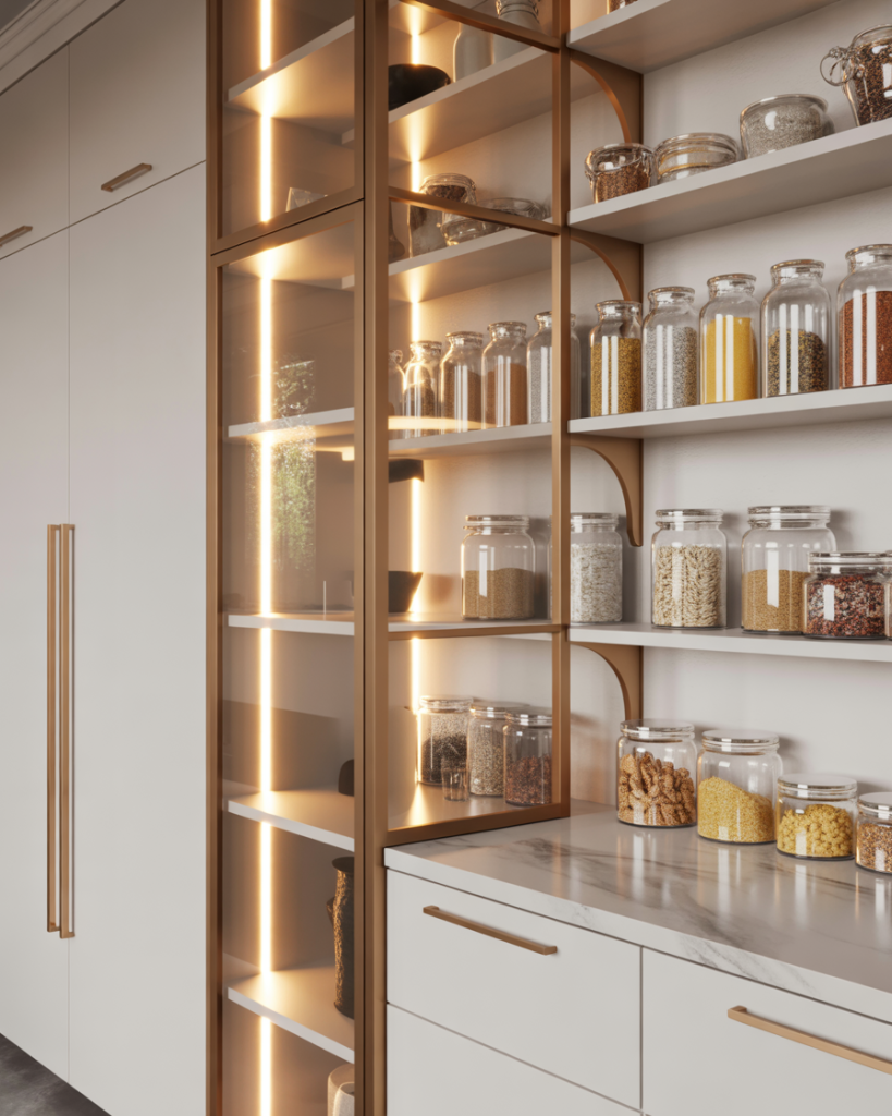 The new wave of luxury pantry design treats storage like a display. Glass doors, marble counters, matching jars, and hidden lighting make everyday food look boutique-level. It’s the kind of space you open just to admire—something promoted by Studio McGee–style homes where organization doubles as décor. It’s indulgent, yes, but also surprisingly calming.