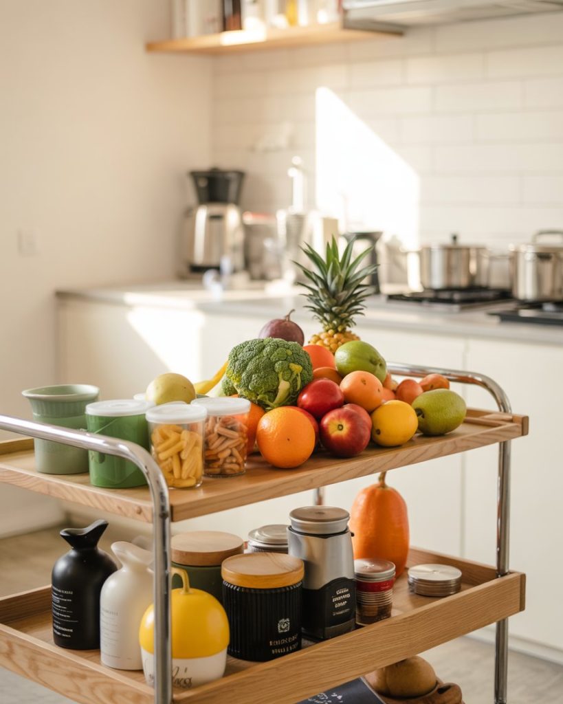 A portable pantry cart brings practicality to small-space living. Stock it with your most-used food items, snacks, or coffee supplies, and roll it wherever you need it. This idea is ideal for apartments or even dorm-style living where permanent walk-in storage isn’t possible.