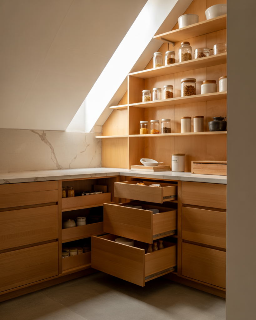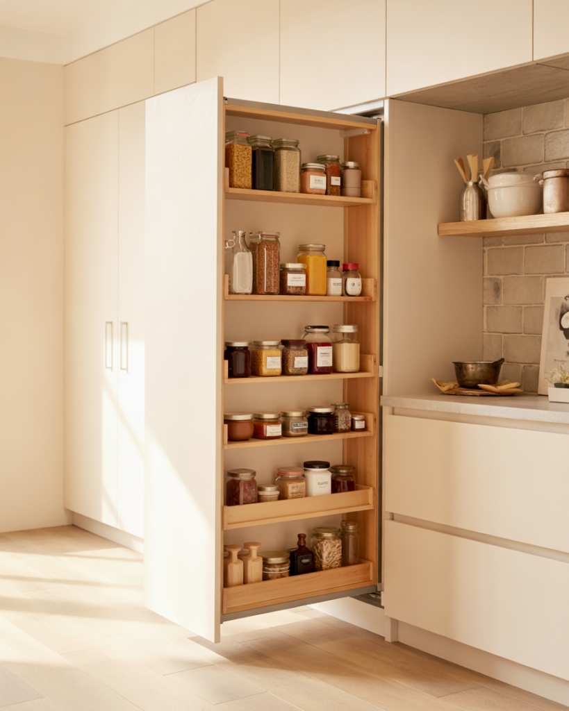 A hidden pantry disguised as part of your kitchen cabinet design keeps clutter out of sight while maintaining an elegant aesthetic. Inside, use baskets, glass jars, and labeled shelves to organize your food and snack items. It’s perfect for small kitchens or apartments where every inch must serve a purpose.