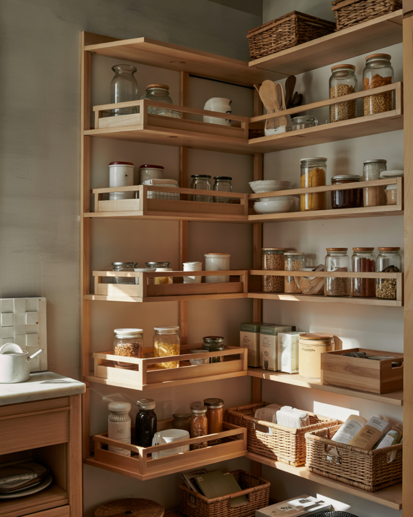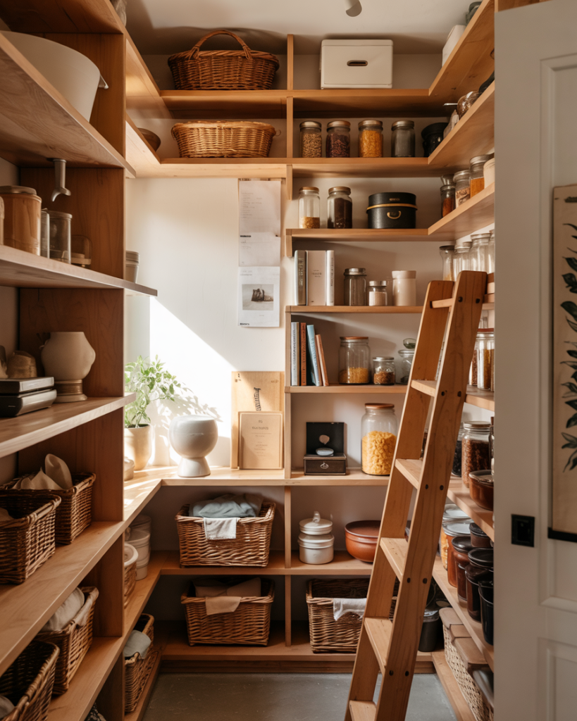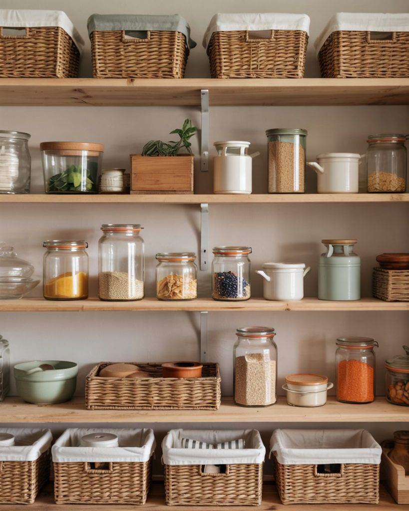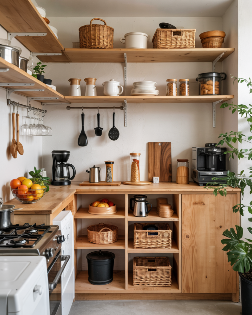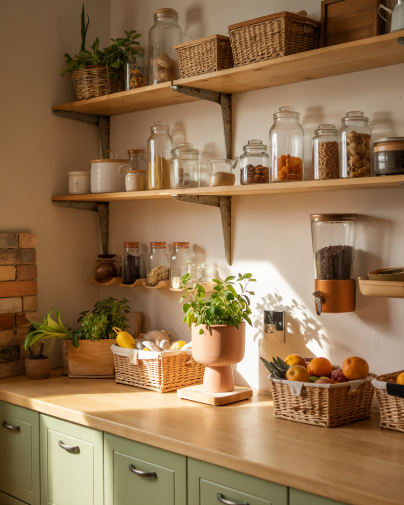 An open pantry feels airy, organized, and intentional. Display your baskets, jars, and containers for an aesthetic touch that keeps everything visible and easy to grab. This idea works beautifully in small-space kitchens, blending function with visual harmony. Use uniform materials for jars and add wooden accents for warmth.