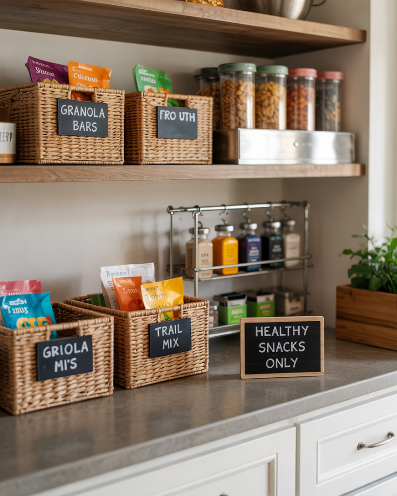Add personality and order by using color-coded baskets, bins, or labels. Assign a shade for baking, snacks, or kids’ lunch items. This idea simplifies your daily routine and brings playful energy to any kitchen, big or small.