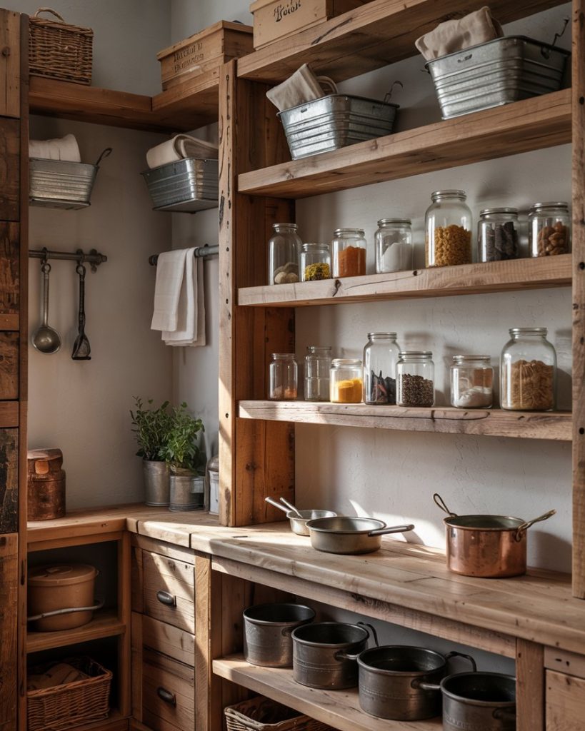 A DIY pantry made with reclaimed wood gives a warm, farmhouse feel. Pair wooden shelves with metal baskets for a balance between rustic and modern aesthetics. It’s a realistic project that suits both large country homes and cozy apartments.