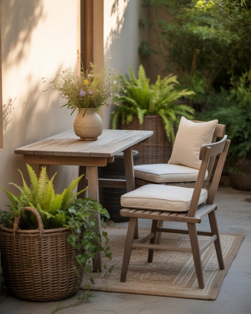 A rustic patio embraces texture and warmth by using reclaimed wood, wrought iron, and earthy tones. Whether it’s a backyard deck or a small apartment balcony, natural materials paired with plants and lanterns add timeless charm. This look works well with concrete floors and farmhouse touches, offering character on even an apartment cheap budget. The beauty lies in the imperfections, making every piece feel authentic.