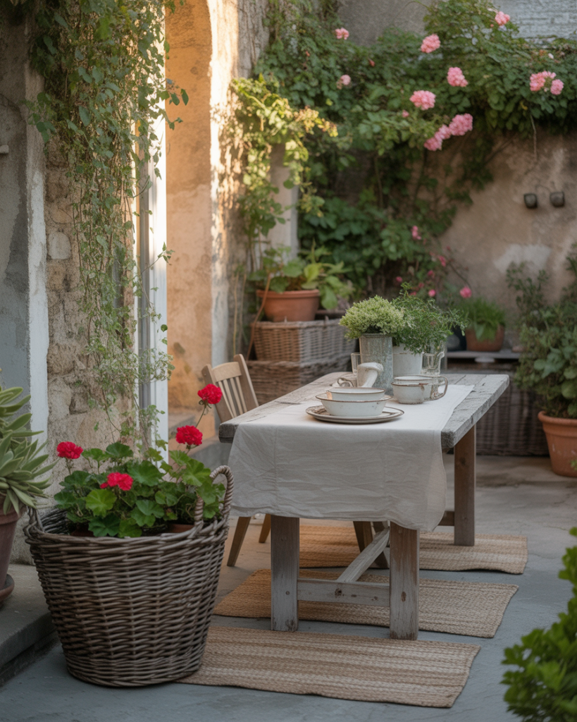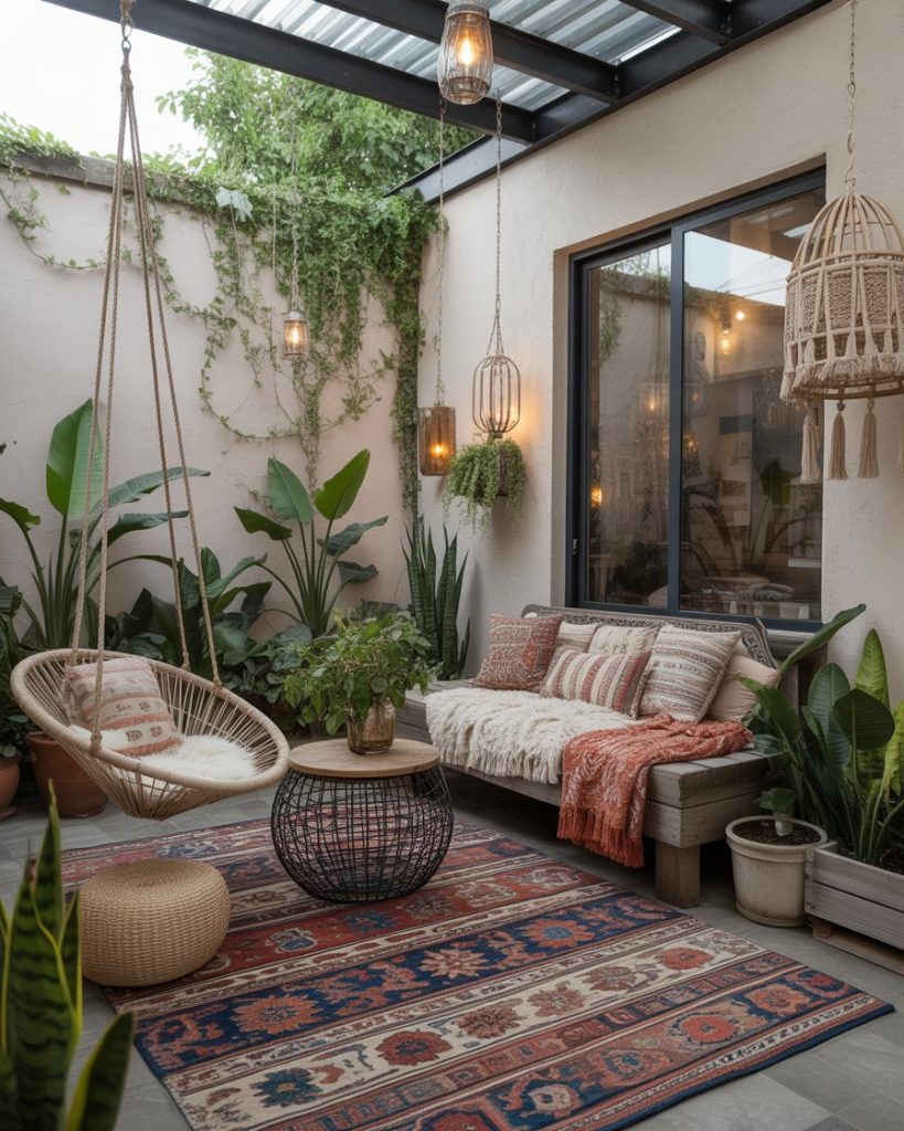 The bohemian style is all about layering—rugs, colorful pillows, and hanging lanterns. Add plants in woven baskets or macrame holders to bring life to the space. This boho look works in both large backyards and apartment cheap balconies. It’s personal, eclectic, and often built on thrifted finds, making it easy to decorate on a budget. Influencers like Justina Blakeney have helped make this playful style a favorite.