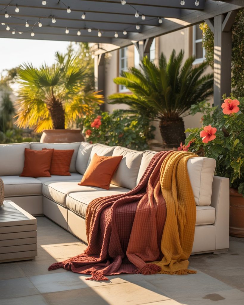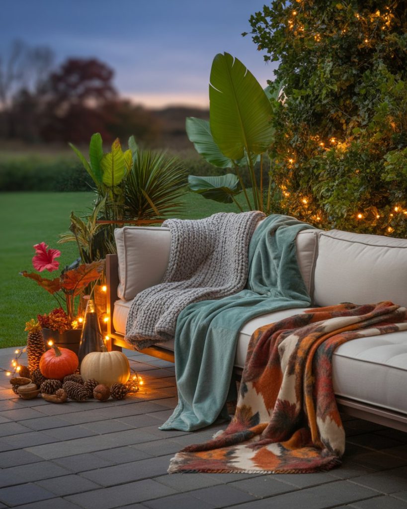 One of the most practical patio trends for 2026 is seasonal adaptability. Layer rustic pumpkins and blankets in fall, tropical plants in summer, and Christmas lights in winter. Even in a small space, these affordable touches make patios cozy year-round. This approach works for both front porches and cozy back patios, ensuring your outdoor area always feels updated and inviting.