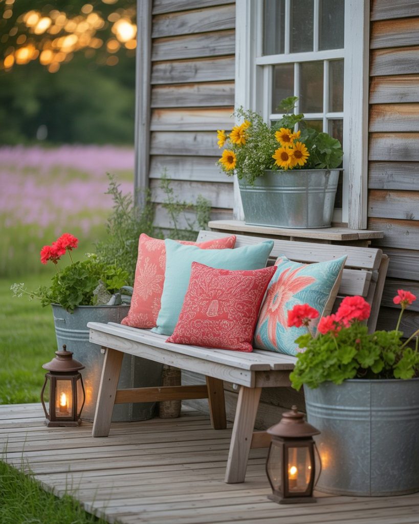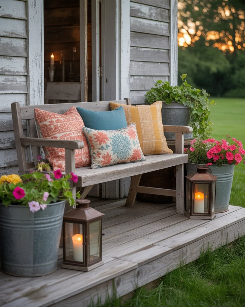 The front patio is the first impression of your home, and a farmhouse design makes it welcoming. Add a bench with colorful pillows, potted plants in galvanized buckets, and rustic lanterns for a timeless look. Even on a budget, you can style a small space to feel inviting. Seasonal wreaths or Christmas garlands keep it refreshed throughout the year while maintaining that rustic charm.