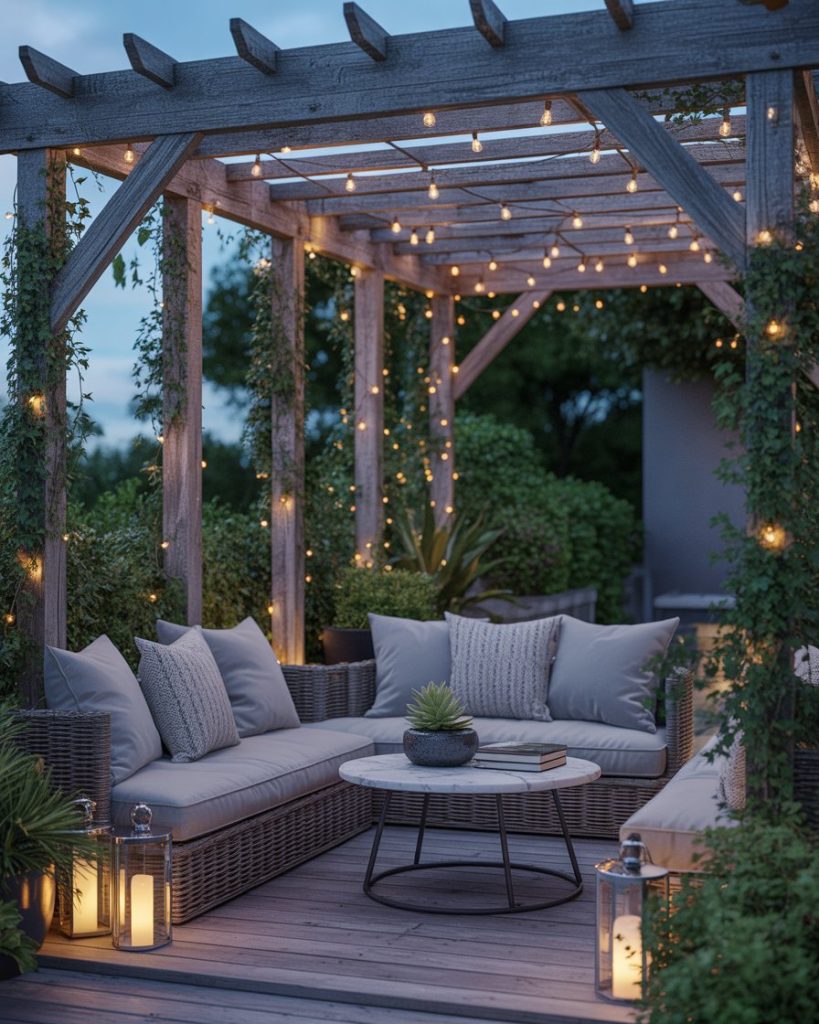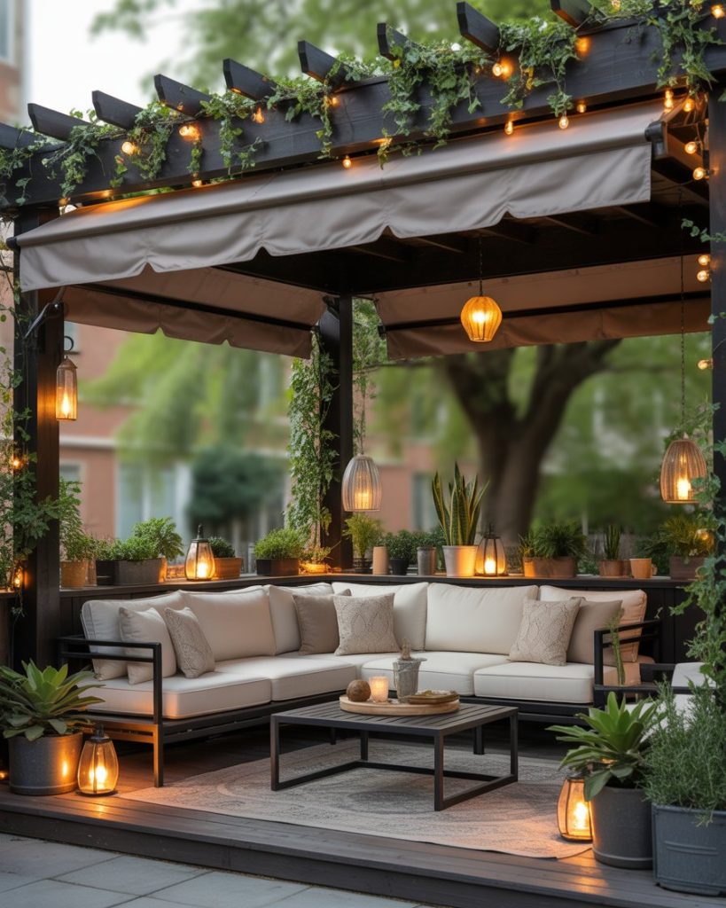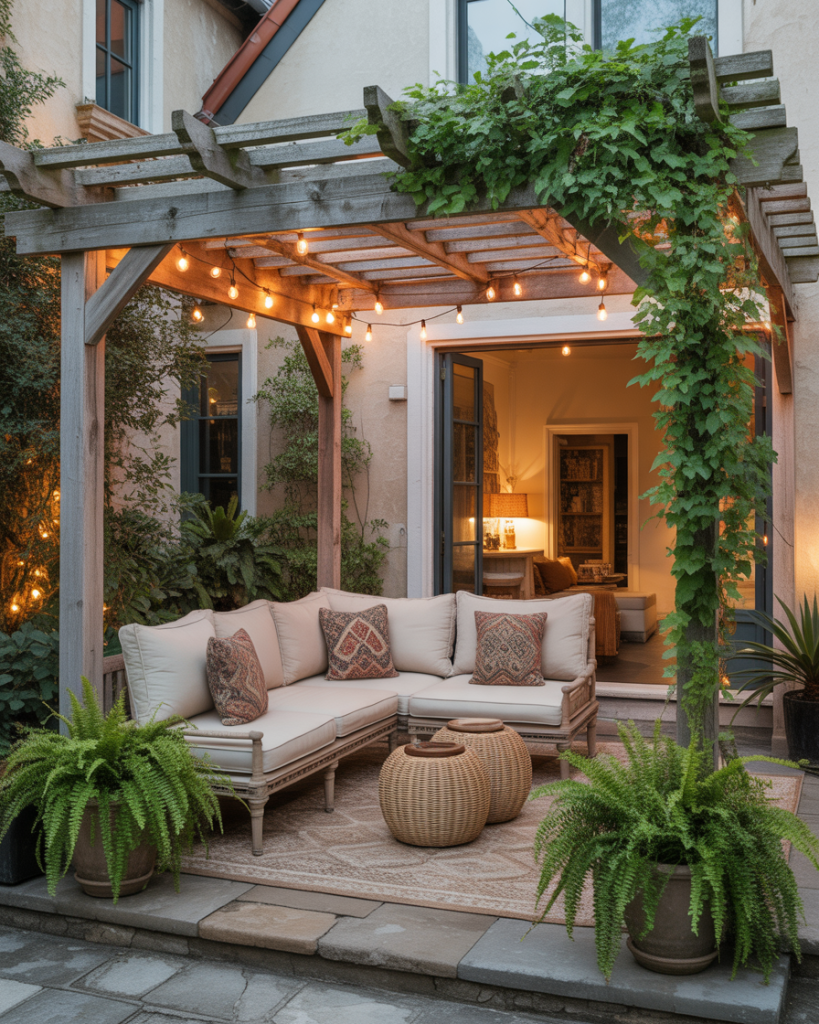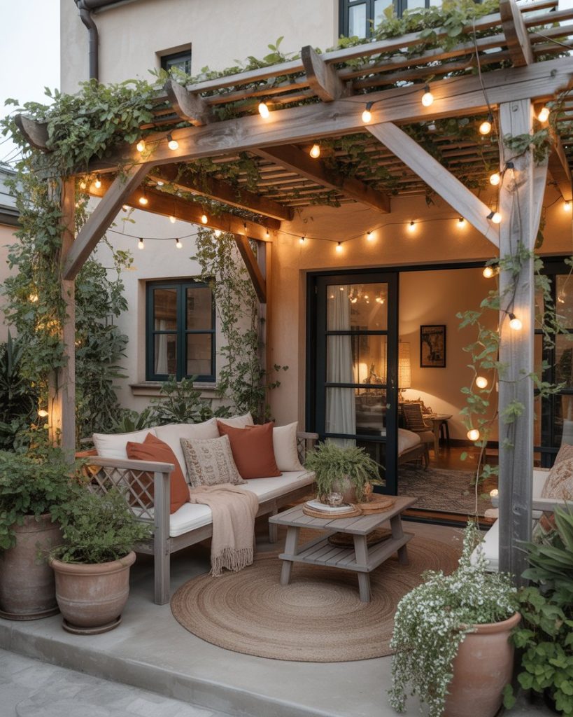 Adding a covered element like a pergola makes patios more practical year-round. From large backyards to small apartment balconies, shade structures extend your living space. Combine soft seating, layered lighting, and indoor-inspired rugs to create a cozy back area. This approach balances style with function and works for families who want their patio to feel like a second living room.