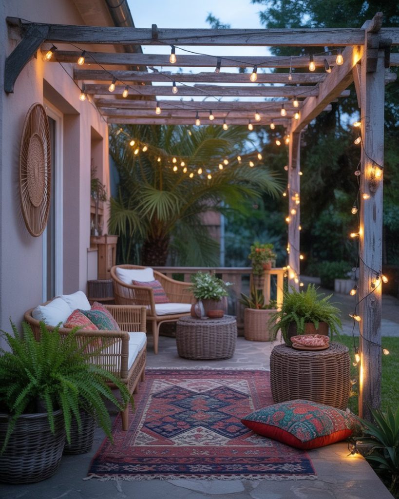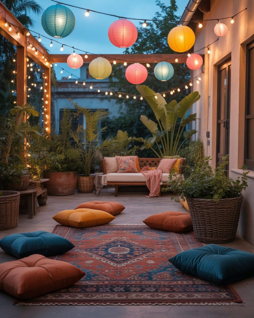 Why not combine bohemian style with festive vibes? A patio dressed with layered rugs, colorful lanterns, and Christmas lights creates a magical atmosphere. Add low seating, floor cushions, and plants in woven baskets for a relaxed boho holiday look. Perfect for apartment cheap balconies or large backyards, this design feels cozy, eclectic, and joyful year-round, with easy adjustments for different seasons.