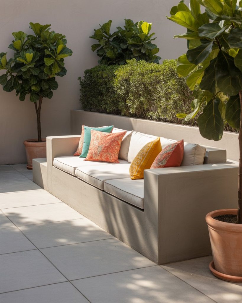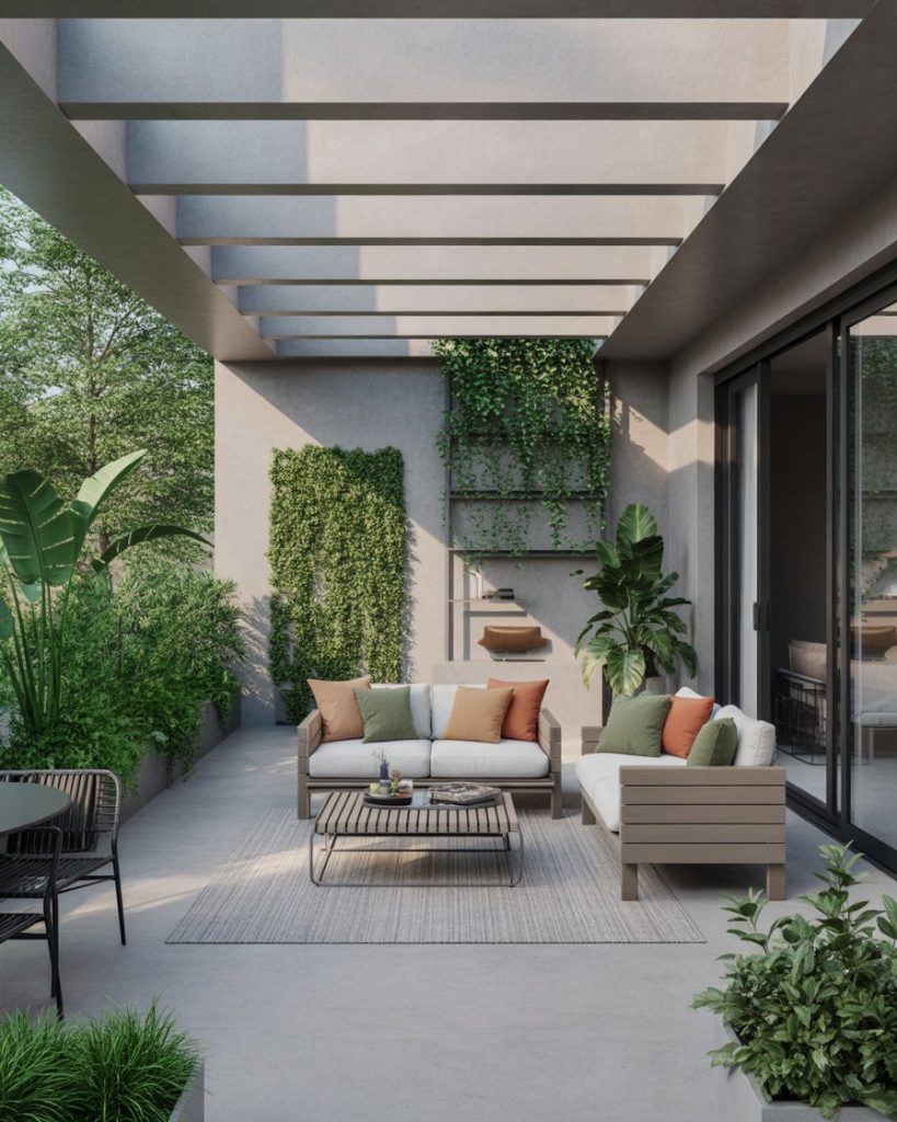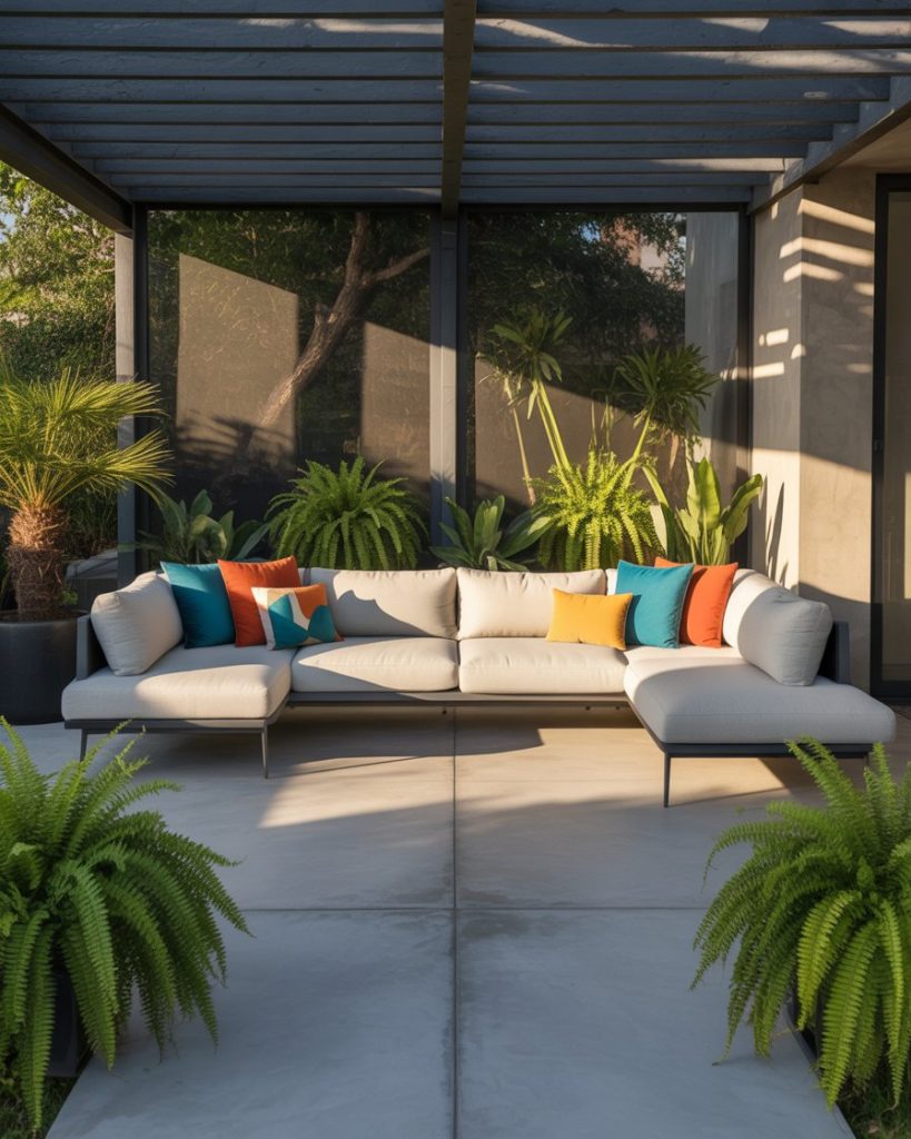 A sleek concrete patio paired with lush plants creates a striking modern effect. Minimal furniture and clean lines highlight the natural beauty of greenery, while colorful pillows bring warmth. This style fits small space balconies as well as large outdoor areas. A covered canopy or screened in section can soften the industrial edge, offering a balance between urban design and natural comfort.