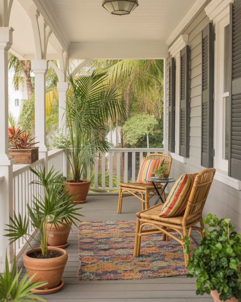 Turn your front porch into a tropical haven with bright textiles, bamboo chairs, and leafy plants. Even in a small apartment, you can use potted palms and colorful rugs for instant vacation vibes. This style works on a budget, focusing on affordable accessories and clever layering. It’s the perfect way to greet guests with a splash of greenery and cheerful atmosphere.