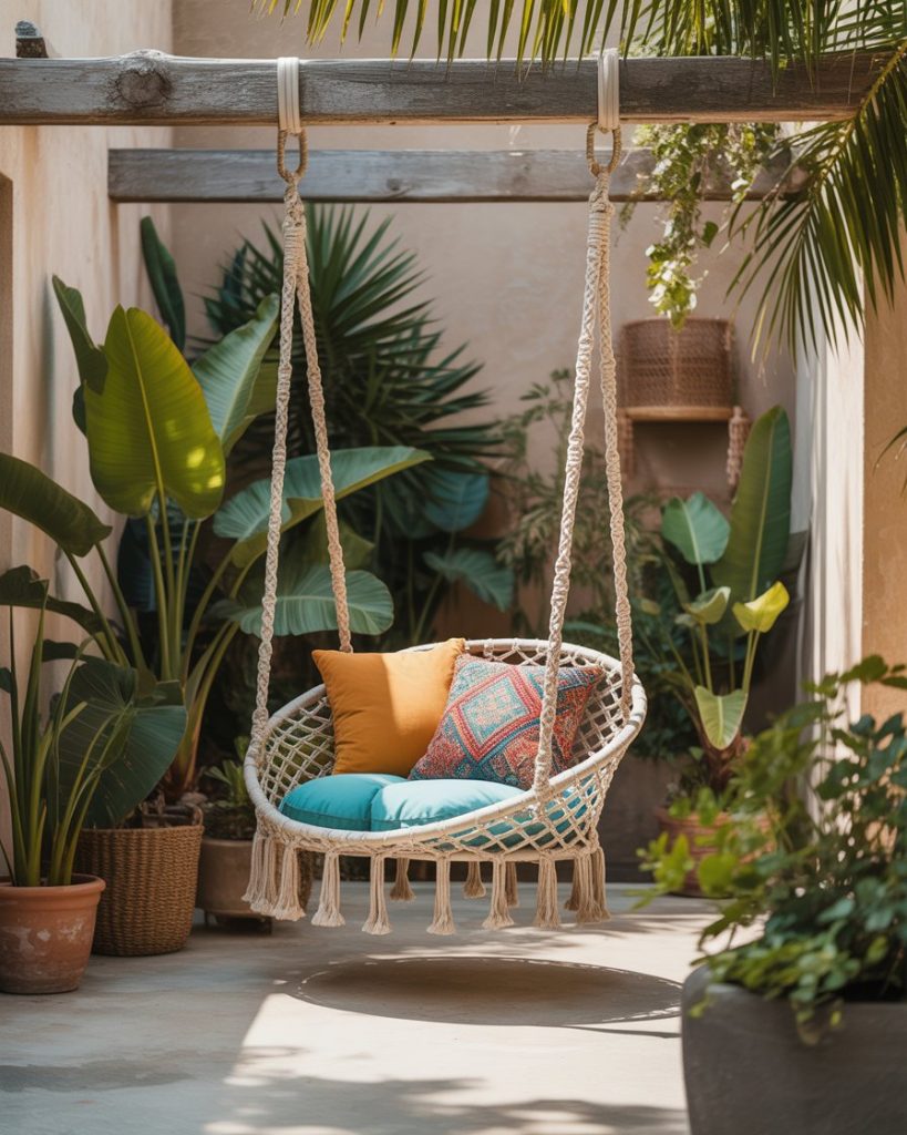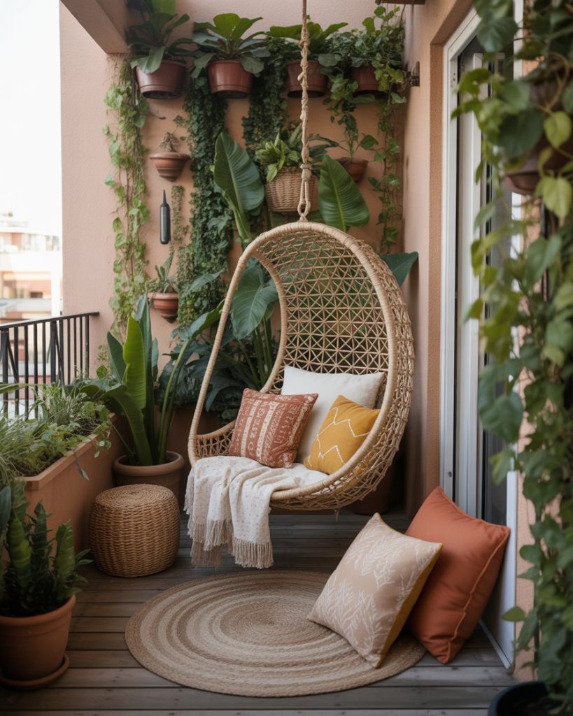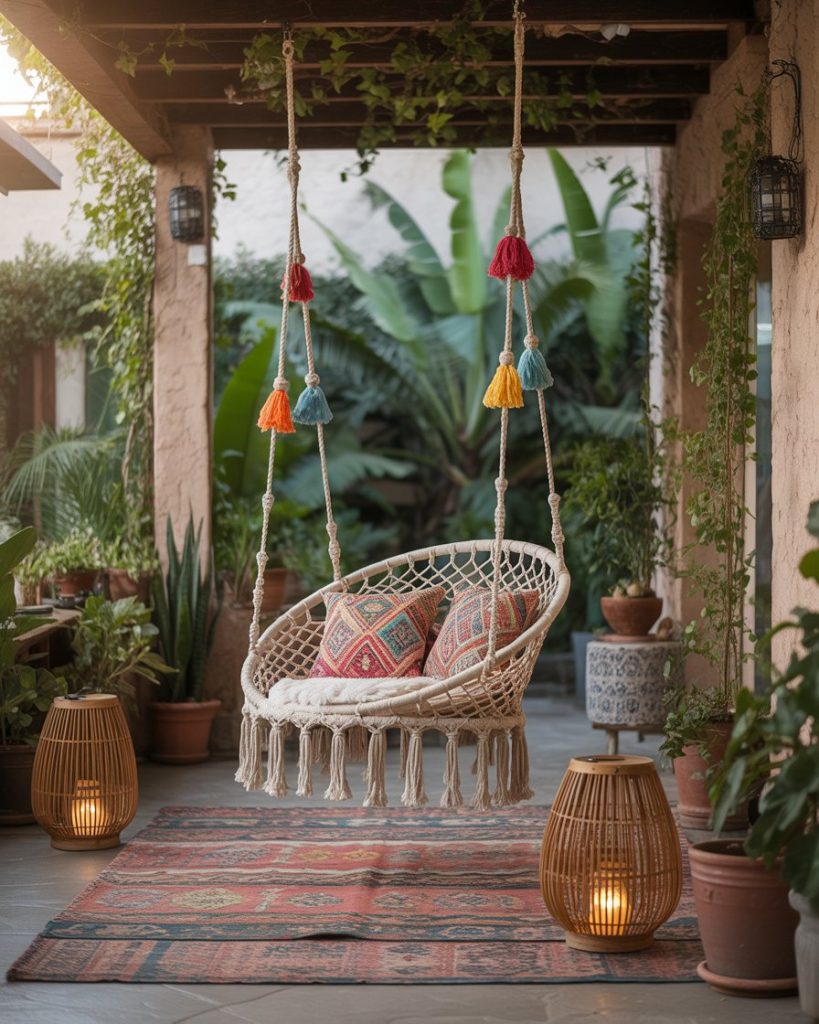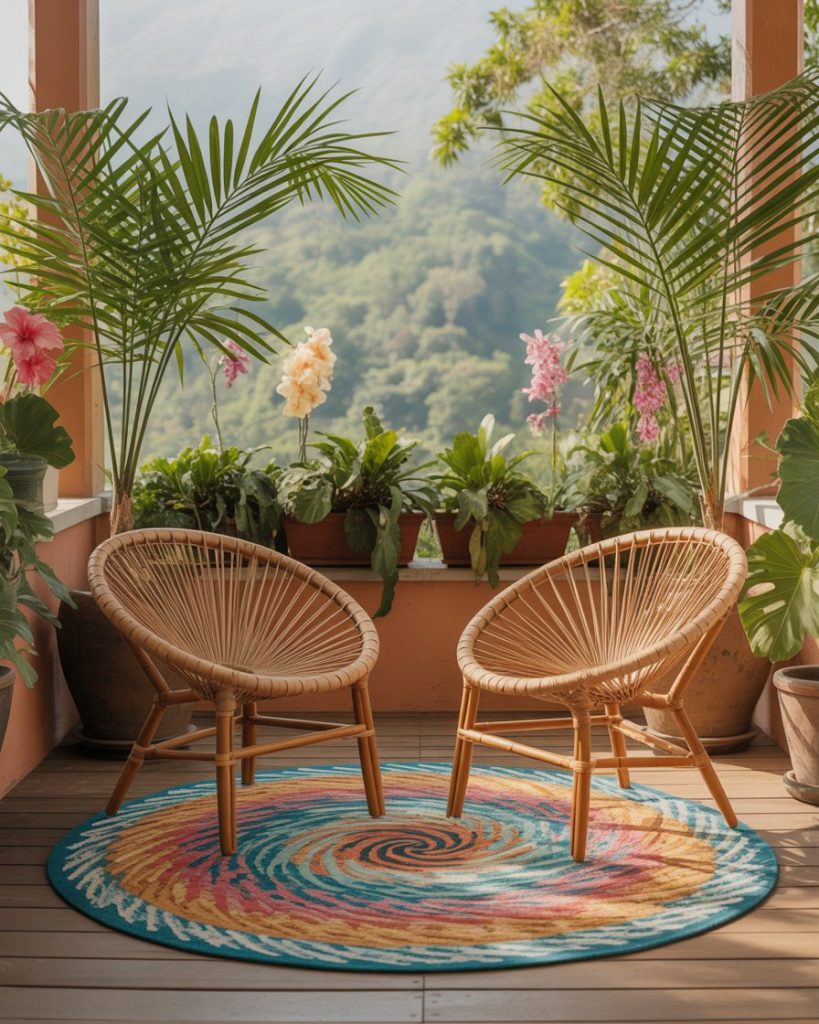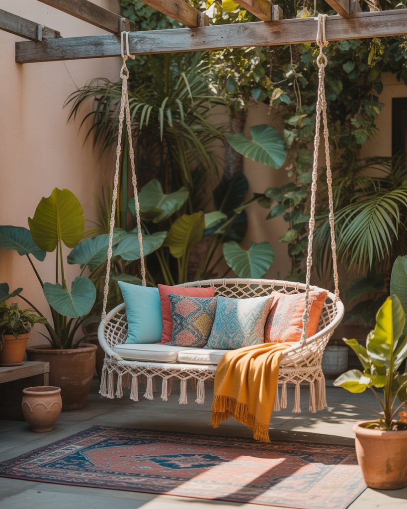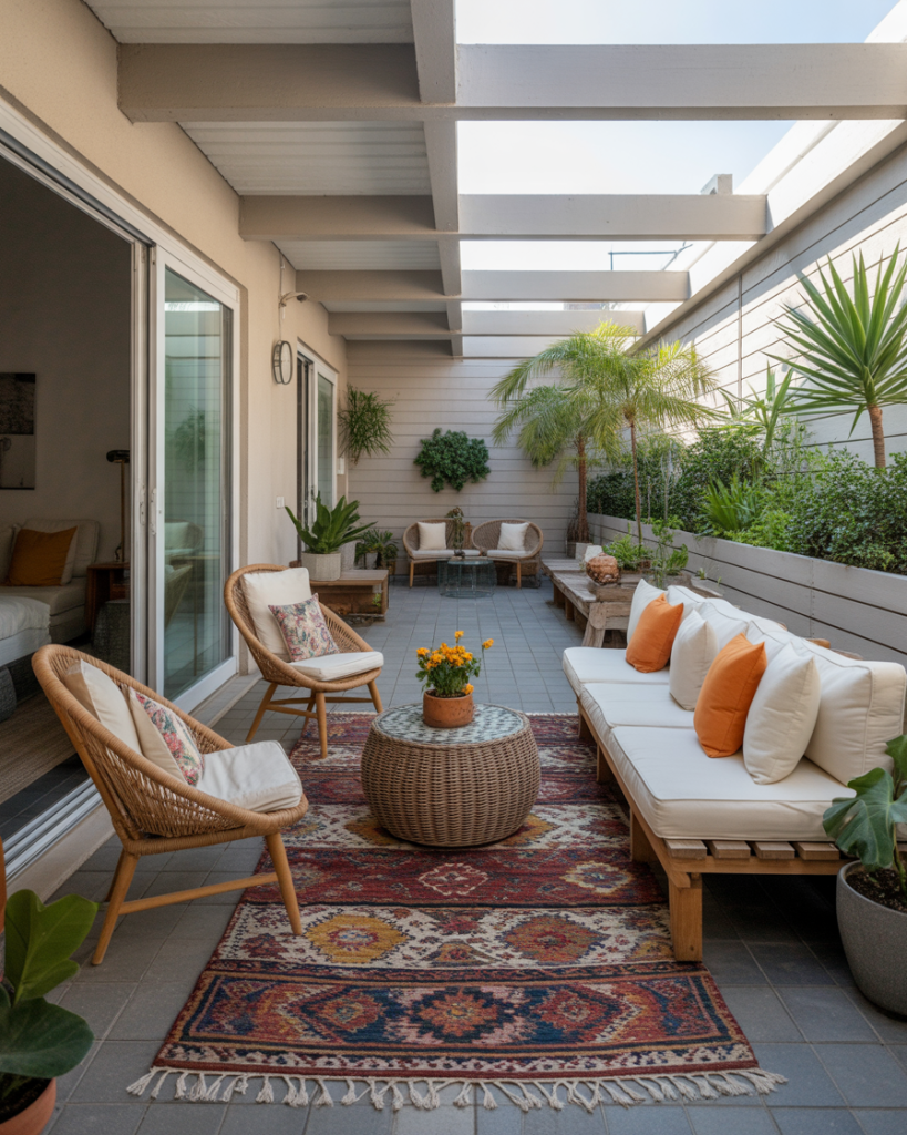 If you can’t choose between boho and tropical, combine them. Macrame swings, patterned textiles, and oversized plants set the tone. Add colorful rugs for vibrancy and keep the vibe cozy. This look adapts well to both apartment cheap balconies and backyard decks. It’s playful, fresh, and affordable, making it a favorite among design lovers looking for personality without breaking the bank.