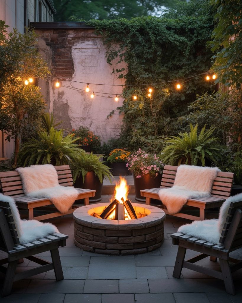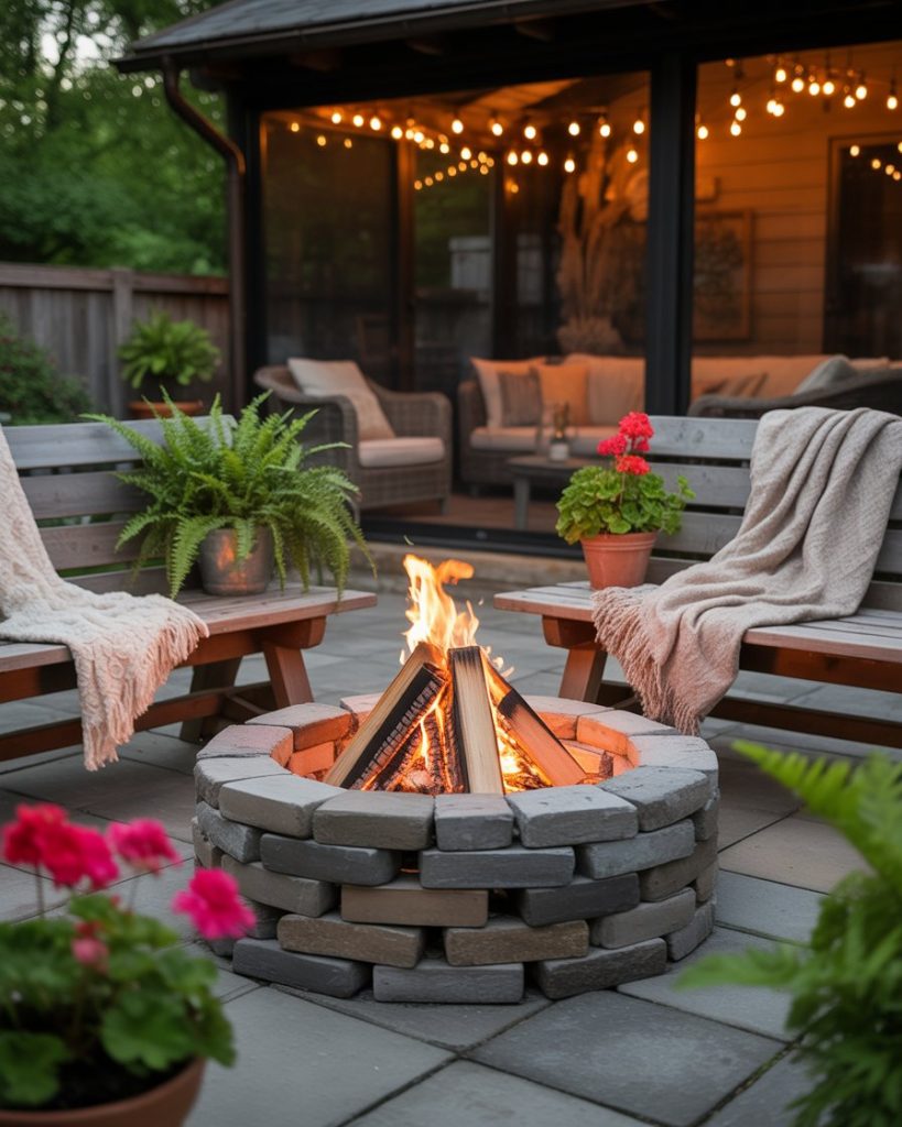 A cozy back patio anchored by a fire pit is perfect for gatherings. Whether it’s a large backyard or a small space, seating around the fire encourages connection. Add rustic benches or modern chairs, plants for softness, and warm throws. This setup works well screened in or outdoor, offering a year-round retreat. It’s functional and stylish, especially for families and friends.