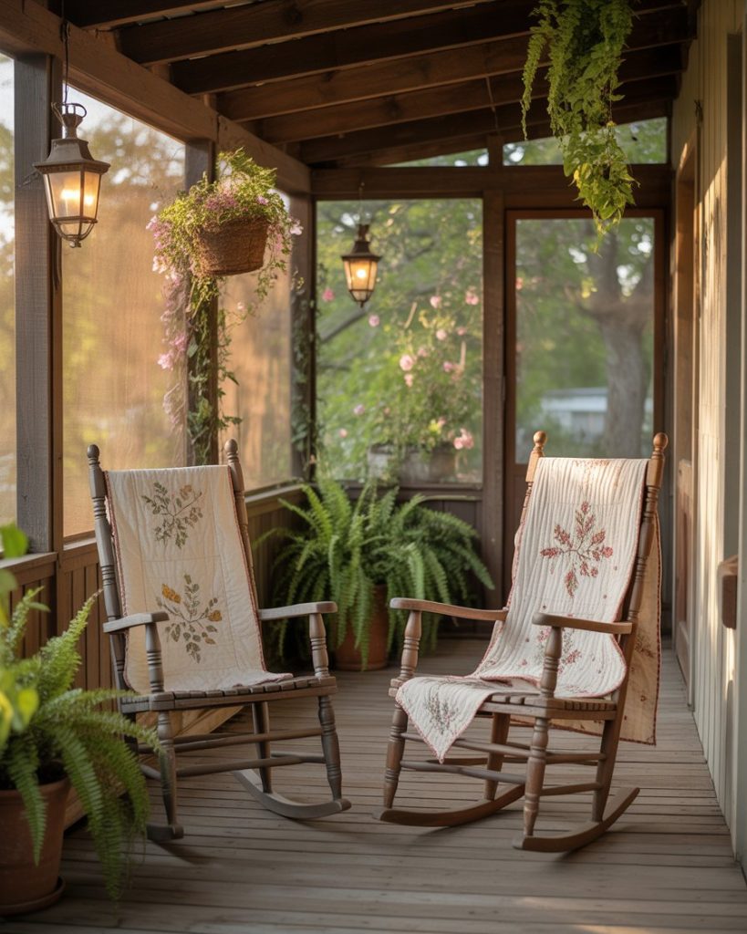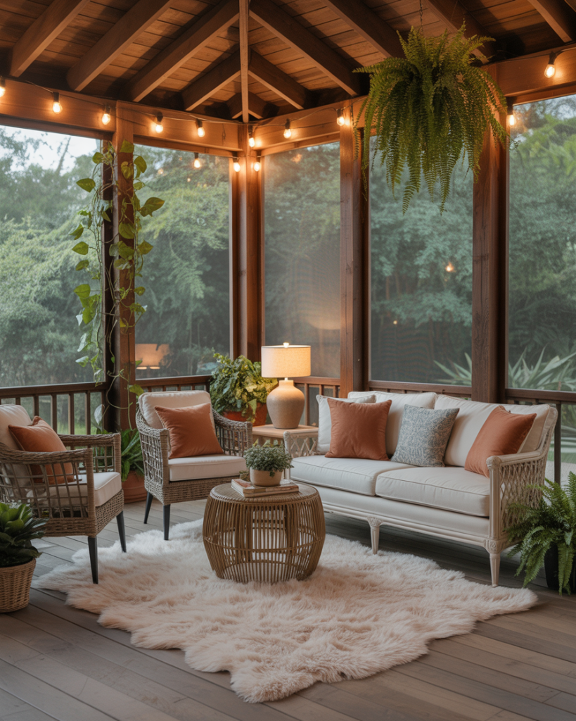 A screened in porch with rustic details offers timeless charm. Think wooden rocking chairs, vintage lanterns, and natural textures. Add soft blankets for a cozy feeling and baskets of plants to bring life inside. This style is adaptable for front porches or backyard retreats, making it a versatile design that feels welcoming year-round. It’s practical and warm, especially in varying climates.