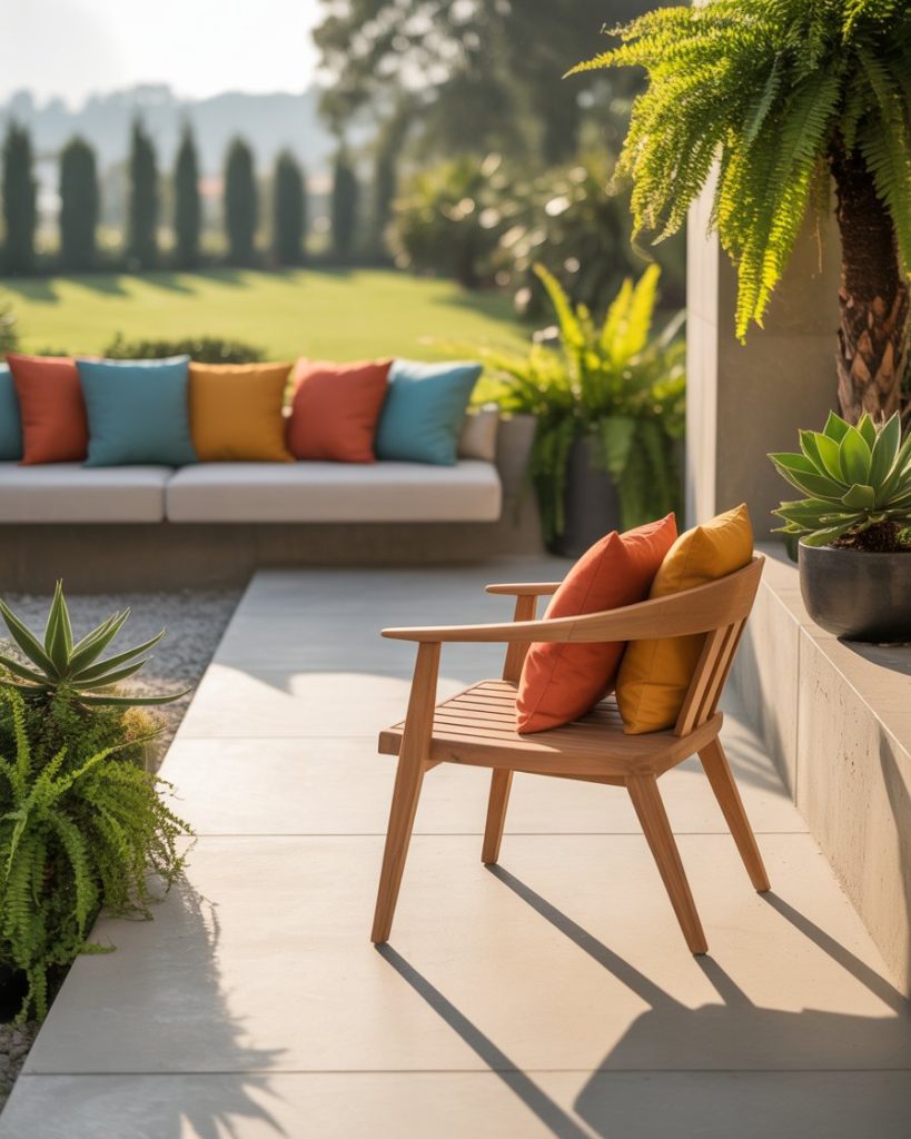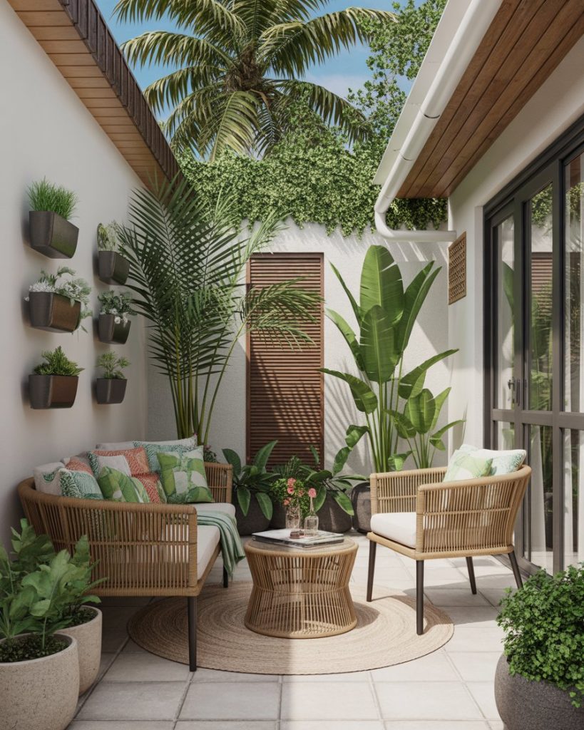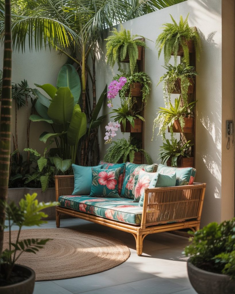 A tropical style patio turns your back area into a vacation retreat. Large leafy plants, bamboo furniture, and colorful cushions create a lively vibe, while vertical gardens make the style possible even in a small space or apartment balcony. For cozy back patios, string lights add warmth among the greenery. This design feels lush yet relaxed, perfect for unwinding without leaving home.