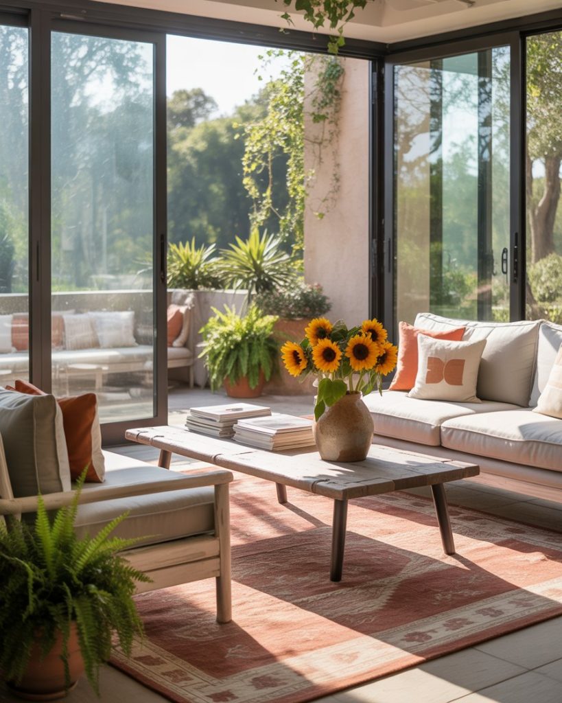 Blurring the line between indoor and outdoor living is a major 2026 trend. Sliding glass doors open to patios styled like living rooms—soft couches, layered rugs, and plants galore. Even in a small apartment, balcony doors can extend the feel of the interior. Add colorful textiles for energy and cozy back seating for balance. This design maximizes every inch while feeling natural and stylish.