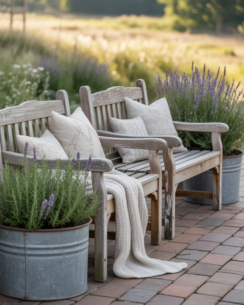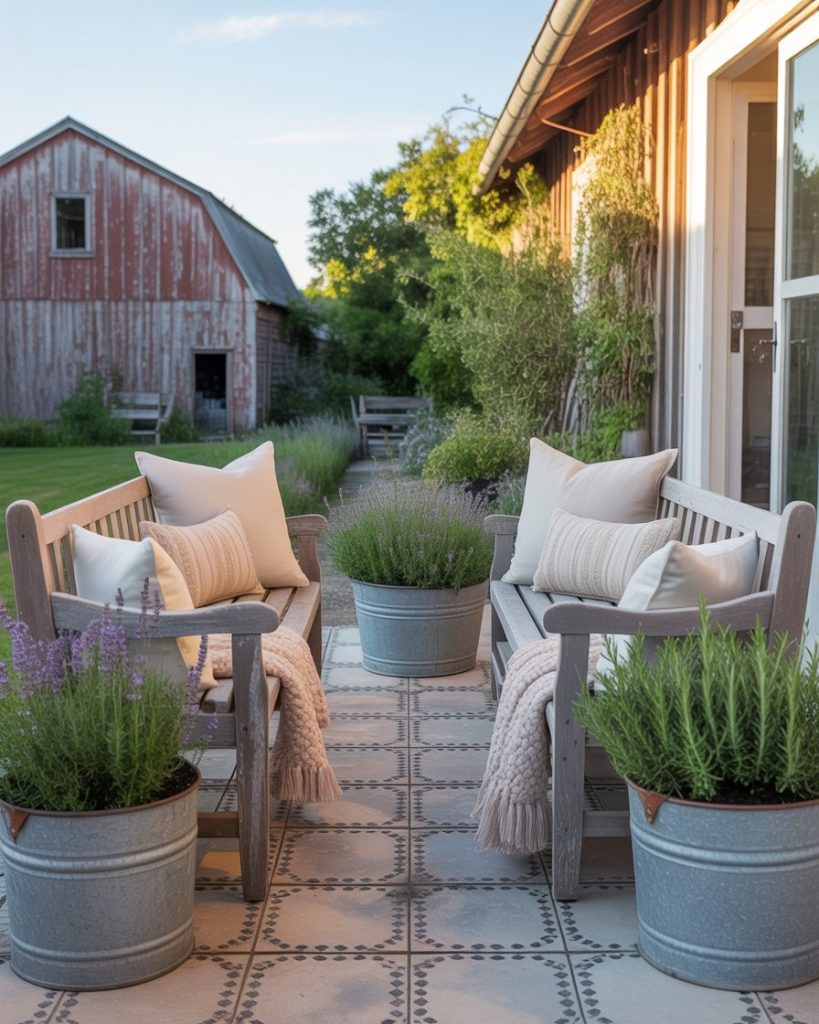 A farmhouse patio feels both simple and welcoming. Think wooden benches, galvanized tubs filled with plants, and concrete or brick flooring softened by cozy textiles. This look is equally effective on a screened in porch or a front entry. For apartment patios, string lights and compact seating capture the same essence on a smaller scale. It’s rustic but practical, adding warmth without fuss.