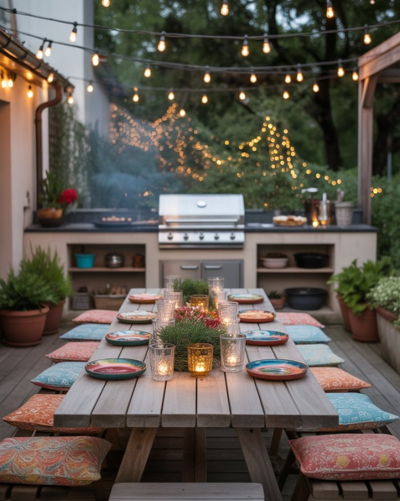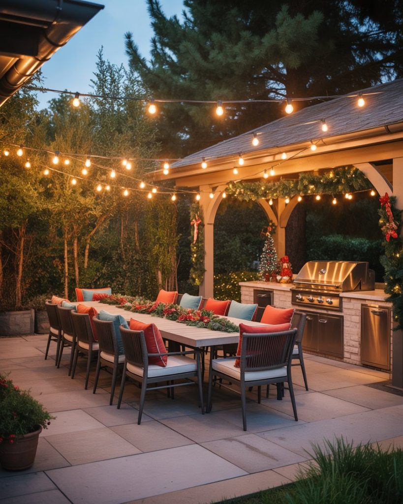 An outdoor entertaining patio makes gatherings effortless. Use a large table, modular seating, and string lights for atmosphere. Even in a small space, foldable chairs or a compact fire pit help set the stage. Seasonal details, from Christmas garlands to summer lanterns, keep the look adaptable. Whether at the front or back, this type of patio becomes an extension of the dining area for family and friends.