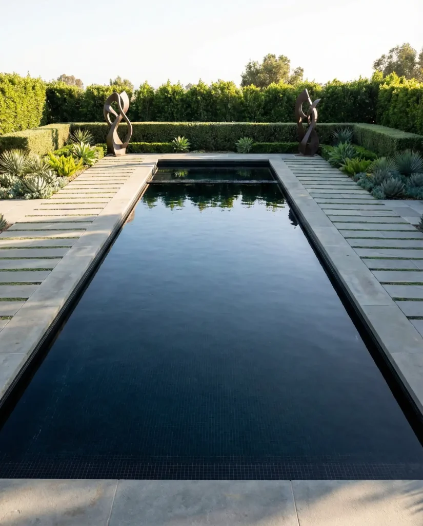 Gaming aesthetics from platforms like Bloxburg are influencing real-world pool design with ultra-modern rectangular forms, sharp angles, and geometric hardscaping that looks almost architectural. These pools feature clean lines, monochromatic color schemes, and symmetrical landscaping with boxwood hedges, ornamental grasses in linear rows, and precisely placed accent plants. The gaming-to-reality translation works because it emphasizes form over fuss—simple shapes, quality materials, and careful proportions create high-impact spaces without excessive decoration.