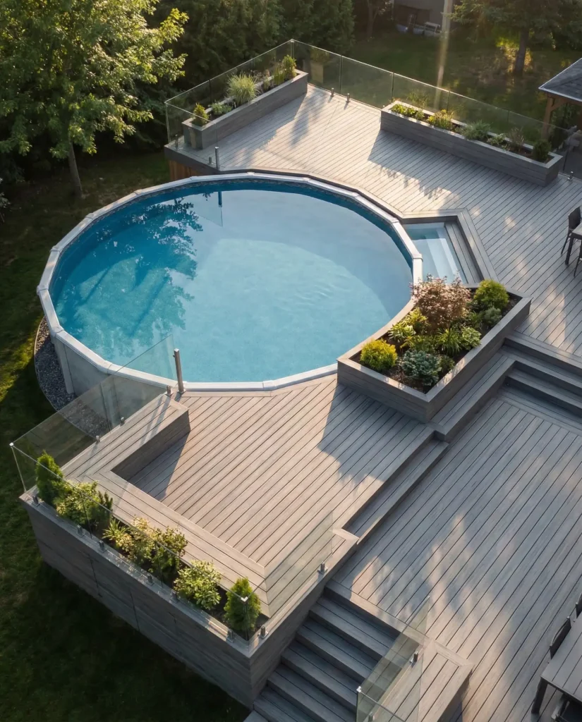 A nice above-ground pool fully wrapped in composite decking breaks the stereotype of cheap temporary installations by creating a permanent-looking feature with all the cost benefits of above-grade construction. Quality composite materials in wood-tone finishes disguise the pool’s metal walls completely, while multi-level deck platforms create lounging areas, plant zones, and entrance stairs that turn the structure into a complete outdoor room. The composite surface stays cooler than traditional wood, resists splinters and rot, and requires virtually zero maintenance beyond occasional cleaning.