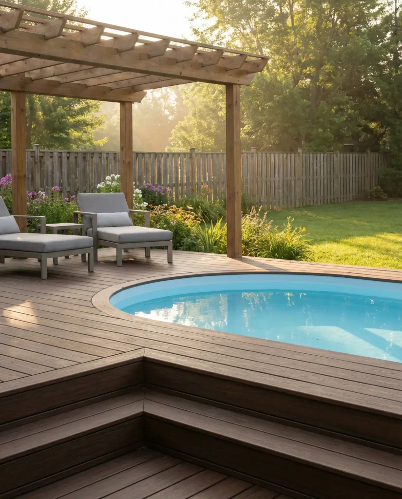 Real homeowner behavior indicates that above-ground pools with quality decking see comparable use rates to in-ground installations while maintaining significant resale advantages—should you move, you can disassemble the pool and potentially take it with you or leave it as a premium amenity that’s fully removable for the next owner. Composite decking costs $25-45 per square foot installed, so wrapping a 24-foot round pool might run $8,000-$15,000, bringing total investment to $12,000-$20,000 compared to $30,000-$50,000 for a basic inground alternative.
