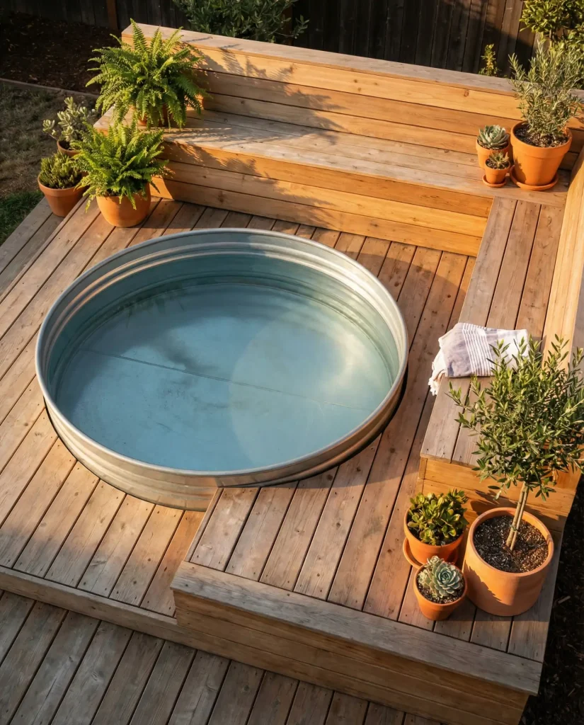 A stock tank pool elevated on a custom wooden deck transforms a simple galvanized tub into a stunning focal point for your backyard. This approach works especially well on sloped terrain where you can build the deck into the hillside, creating a multi-level outdoor living area. The raw metal exterior pairs beautifully with natural wood tones, and the elevated position improves water circulation while making entry and exit more comfortable. Adding built-in bench seating around the perimeter turns the space into a social hub perfect for summer evenings.