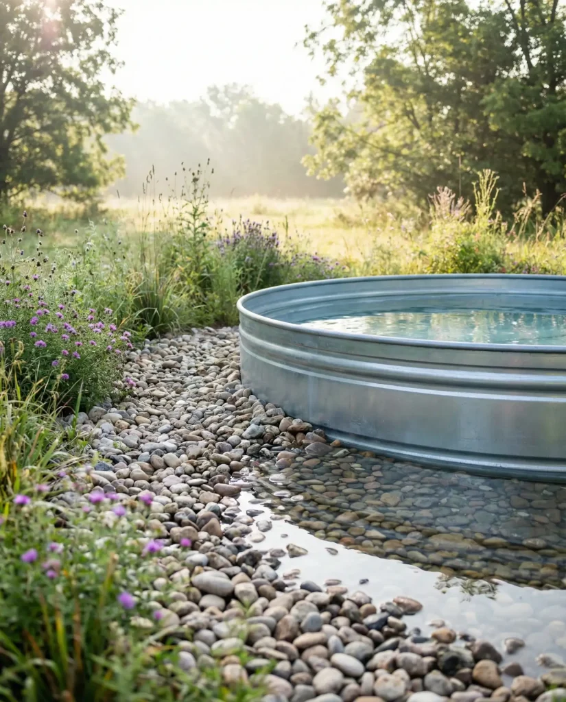 Setting a stock tank pool at ground level and creating a gradual river rock beach entry on one side delivers a naturalistic vibe while solving the accessibility challenge these tall tubs typically present. By excavating 18-24 inches and backfilling one side with graduated stones, you create a gentle walk-in approach that’s safer and more inviting than climbing a ladder. The rock transition blends the industrial tank into organic landscaping, and the permeable stone area provides excellent drainage while functioning as a dry sunbathing zone when you’re not in the water.