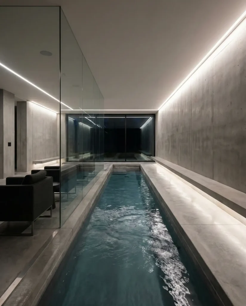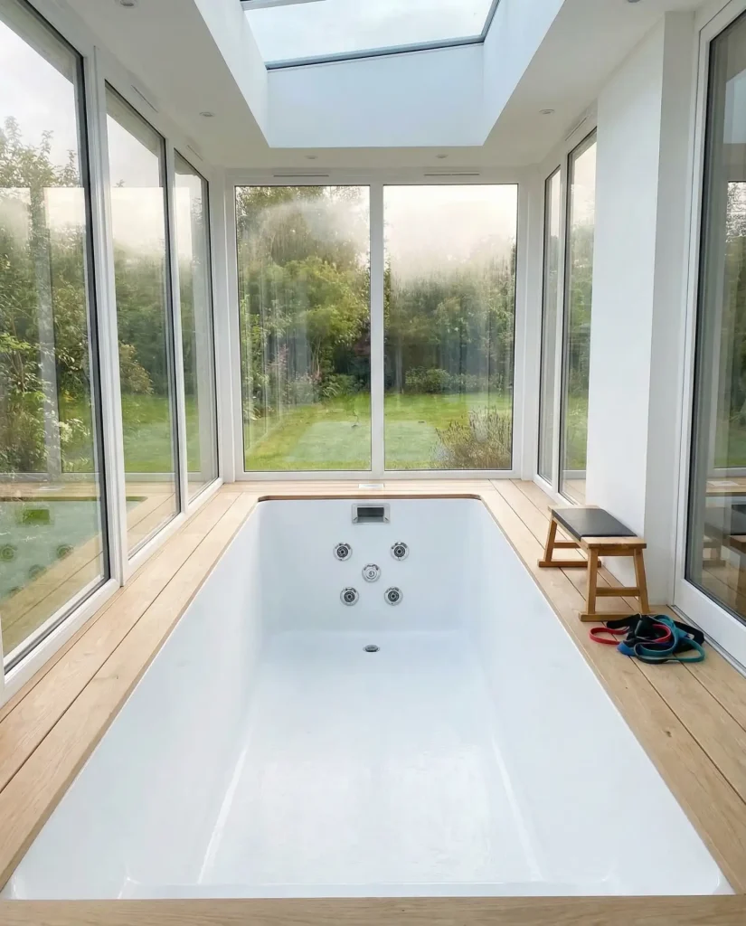 An indoor endless pool with current generators fits into surprisingly compact spaces—often repurposing a spare bedroom, basement area, or attached sunroom—while providing serious swimming training potential regardless of weather. The adjustable current lets users swim continuously in place, getting a full workout in a pool that might measure just 8 by 15 feet. Climate control, privacy, and zero seasonal downtime make these attractive to serious swimmers, physical therapy patients, and fitness enthusiasts who won’t let winter interrupt their routines.