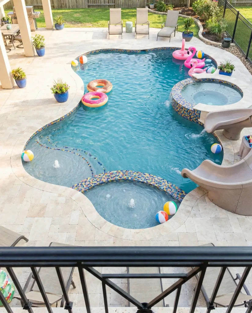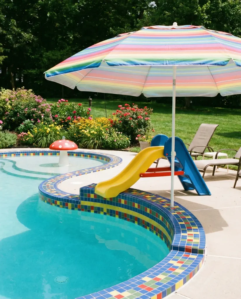 Real homeowner behavior shows that pools designed with children in mind maintain their appeal as kids age—the playful aesthetic evolves into retro charm, and the integrated features that served toddlers become conversation pieces for teenagers entertaining friends. Suburban families in growing communities across Texas, North Carolina, and Georgia gravitate toward this approach because it maximizes the pool’s useful lifespan across different family stages. Budget considerations remain reasonable since the design focuses on smart layout and thoughtful details rather than expensive exotic materials.