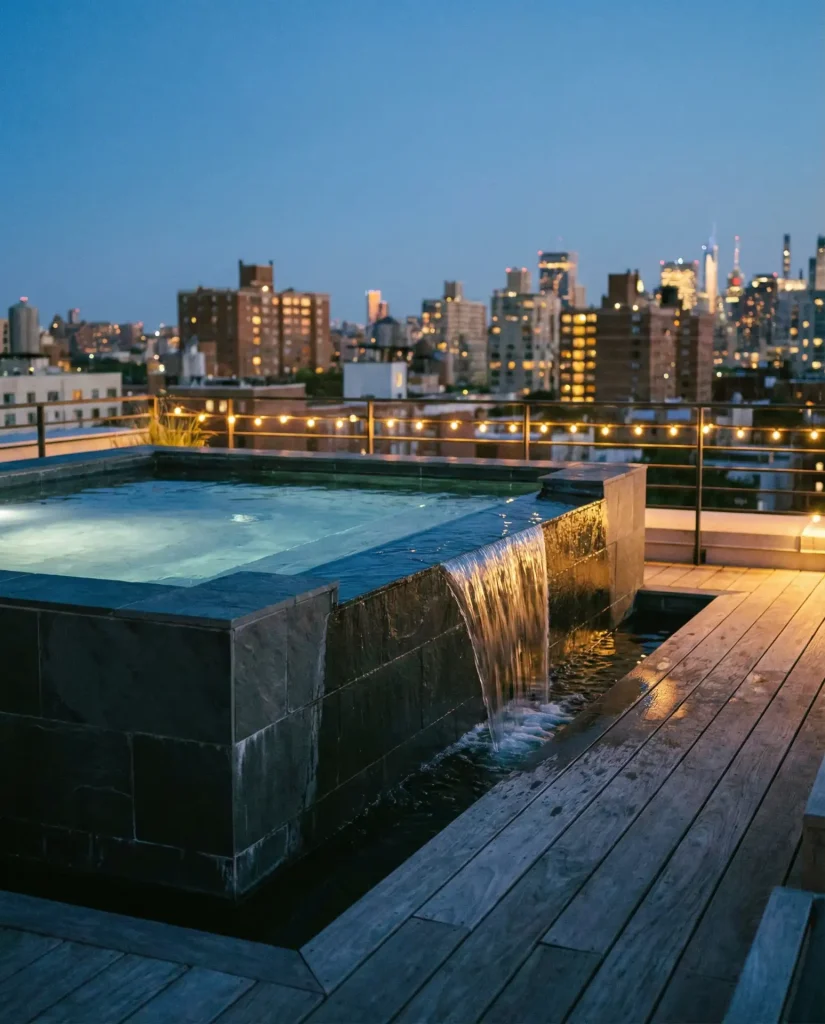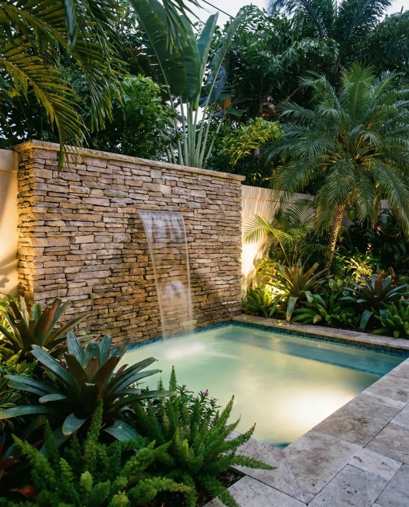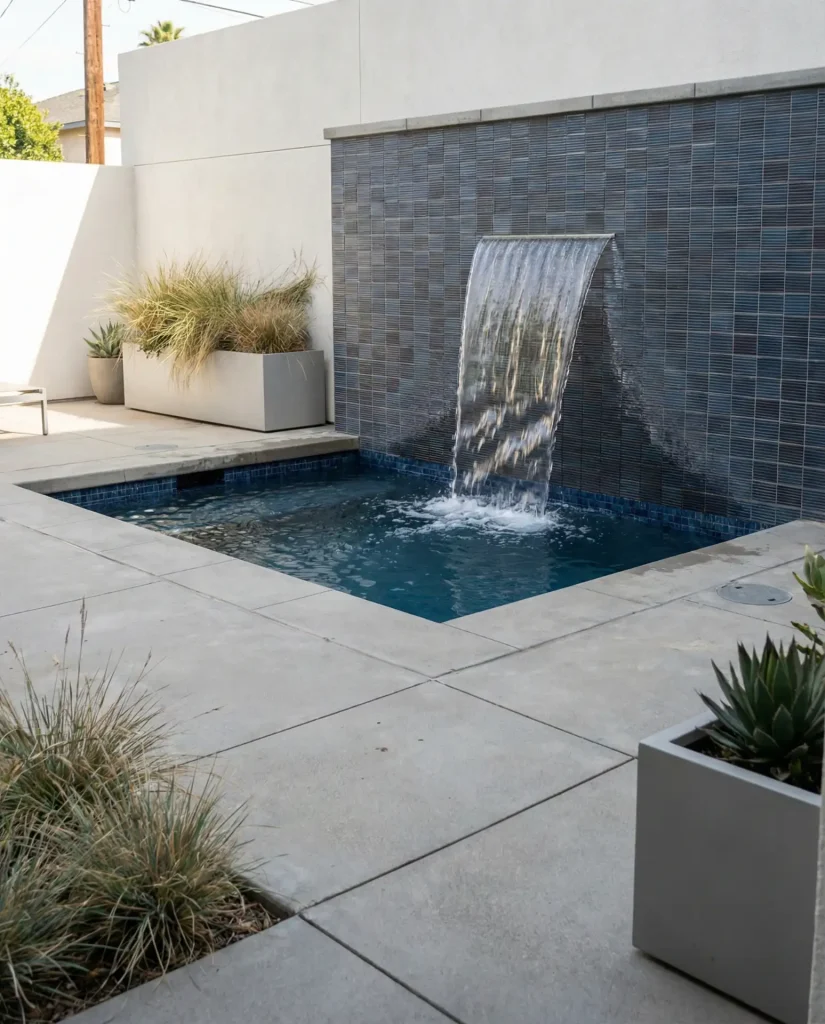A tiny cocktail pool maximizes impact in minimal square footage by incorporating a vertical water feature wall that creates soothing sound while adding architectural interest. These pools typically measure 10 by 10 feet or smaller, with depths of 4 to 5 feet—perfect for cooling off but not designed for swimming laps. The attached fountain wall, clad in stacked stone, tile, or metal panels, becomes a sculptural focal point that makes the compact pool feel like a designer water garden rather than a scaled-down swimming hole.