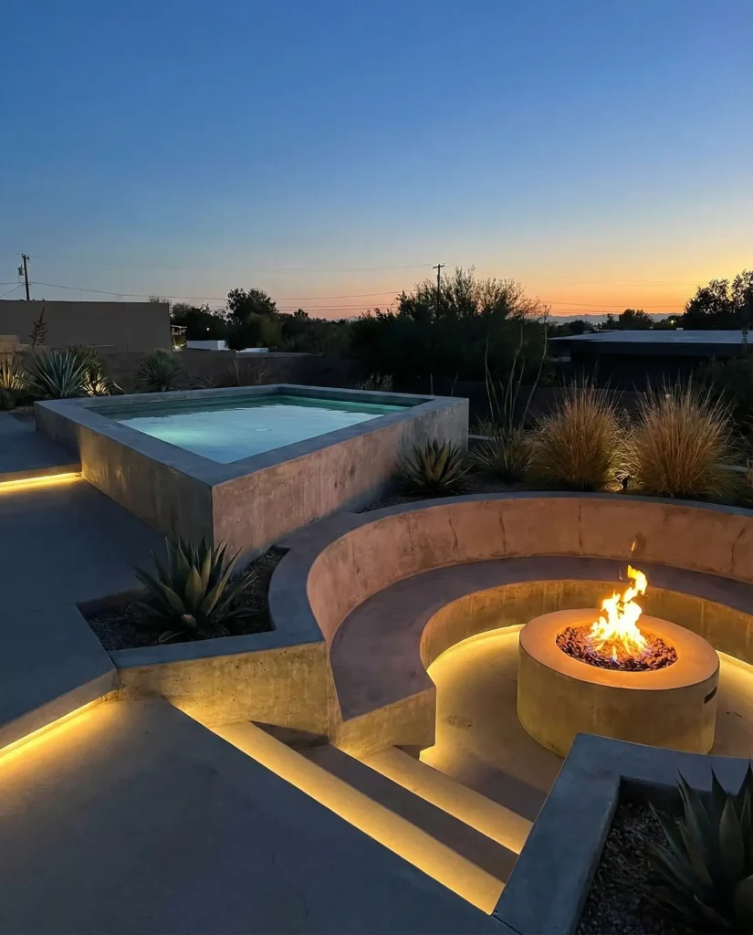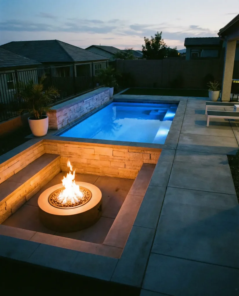 A small inground pool paired with an adjacent sunken fire pit creates a stunning year-round outdoor living complex that maximizes a modest backyard footprint. The pool might measure 12 by 20 feet, while the fire pit sits 18-24 inches below deck level, surrounded by built-in stone or concrete seating. This dual-feature approach extends the useful season—the pool dominates summer months, while the fire pit becomes the gathering spot for spring, fall, and winter evenings. The sunken design for the fire feature creates intimate conversation zones and blocks wind, making flames more stable and heat more effective.