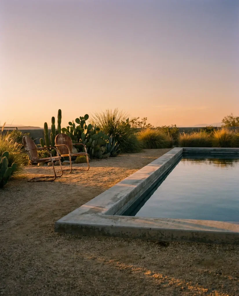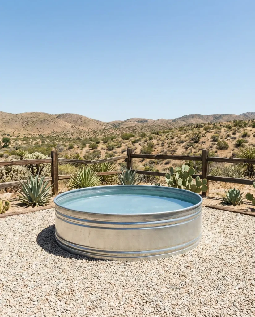 The cowboy pool aesthetic leans into rugged simplicity with galvanized stock tanks or simple rectangular concrete pools surrounded by decomposed granite or pea gravel instead of traditional decking. This low-maintenance approach originated on working ranches where function trumped formality, and it’s now trending among homeowners who want that authentic Western vibe. The permeable gravel surface drains beautifully, prevents muddy poolside messes, and costs a fraction of stamped concrete or pavers while delivering genuine ranch-style charm.