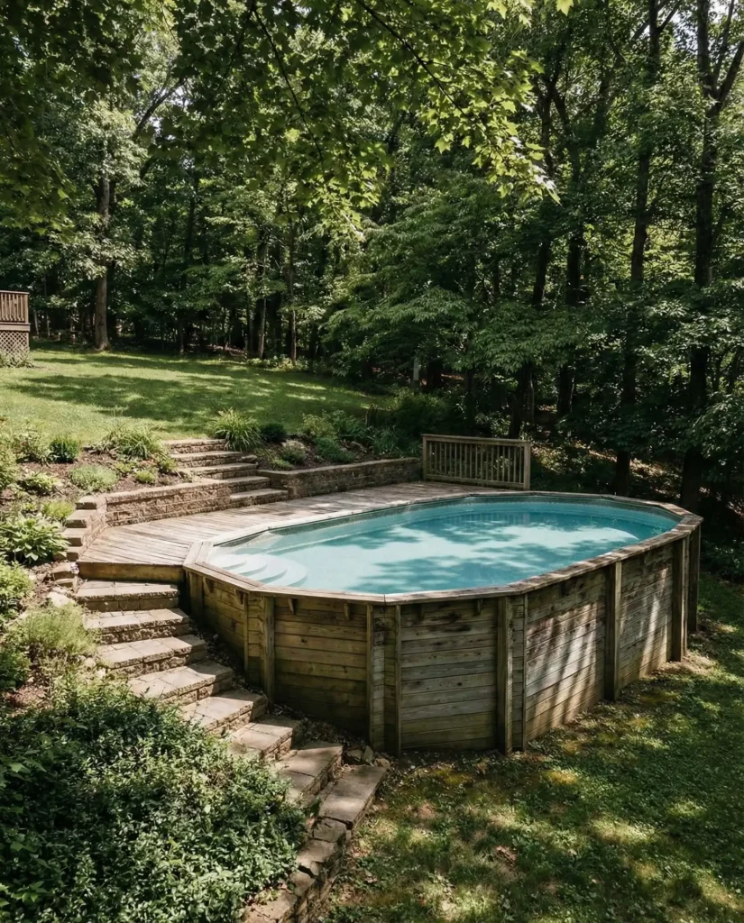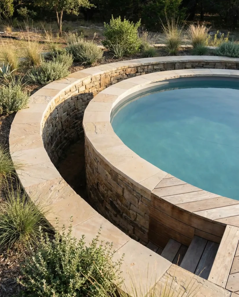 A semi-inground pool gets partially buried into a hillside, creating an inground look on the downhill side while the uphill portion sits above grade with structural walls. This approach dramatically reduces excavation costs on sloped properties while delivering the aesthetic appeal of a fully buried pool from the viewing side. The exposed wall on the uphill side can be finished with stone veneer, stucco, or horizontal wood slats to blend with your home’s architecture, and the built-in retaining wall function eliminates separate hardscaping expenses.