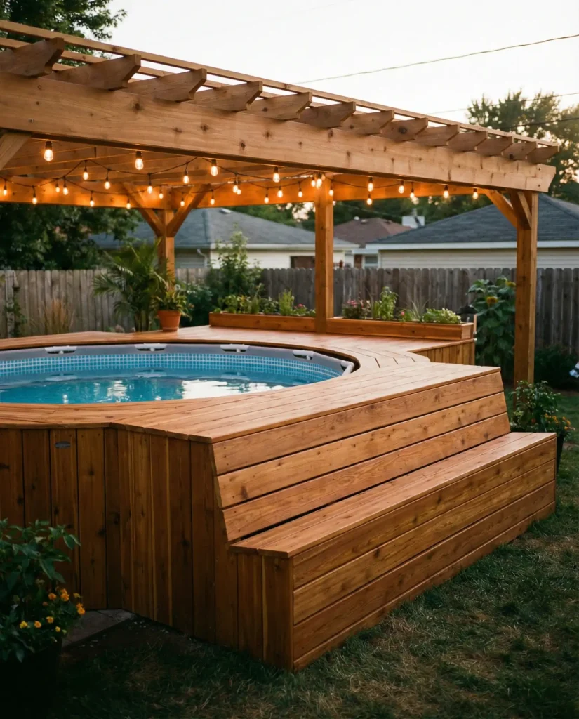 An Intex frame pool—typically considered a temporary summer solution—becomes a permanent landscape feature when surrounded by a thoughtfully designed wooden deck with built-in stairs and privacy screening. These affordable vinyl pools cost $400-$1,500 depending on size, and investing another $2,000-$5,000 in decking transforms the look from “inflatable toy” to “backyard retreat.” The key is treating the frame pool as the water feature within a larger hardscape project, incorporating planters, shade structures, and seating areas that draw attention to the complete environment rather than the pool itself.