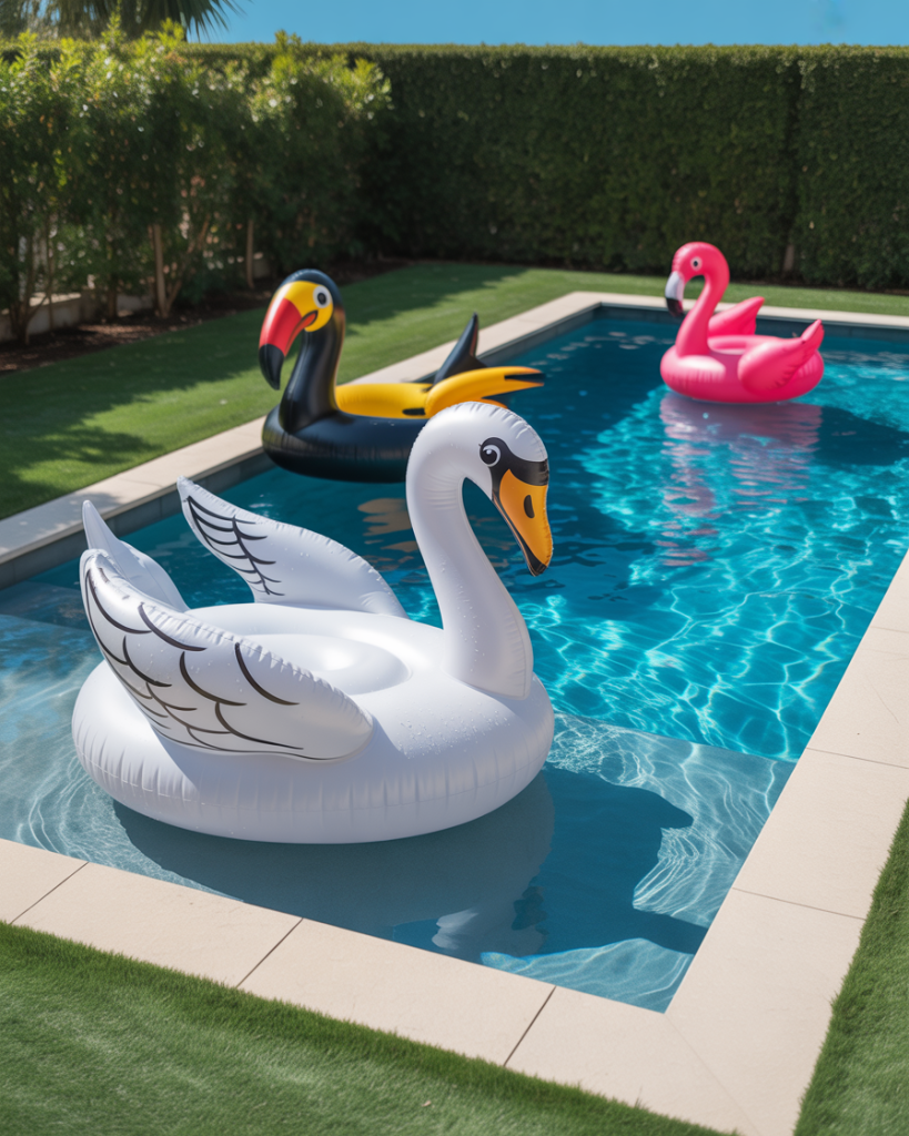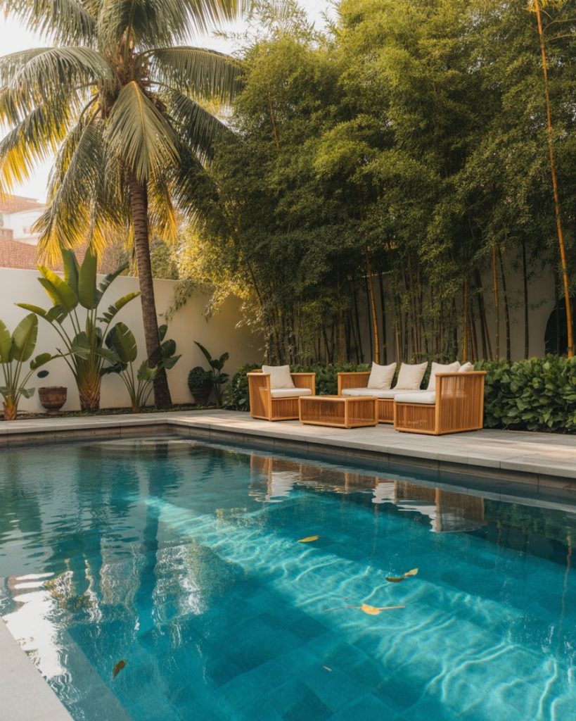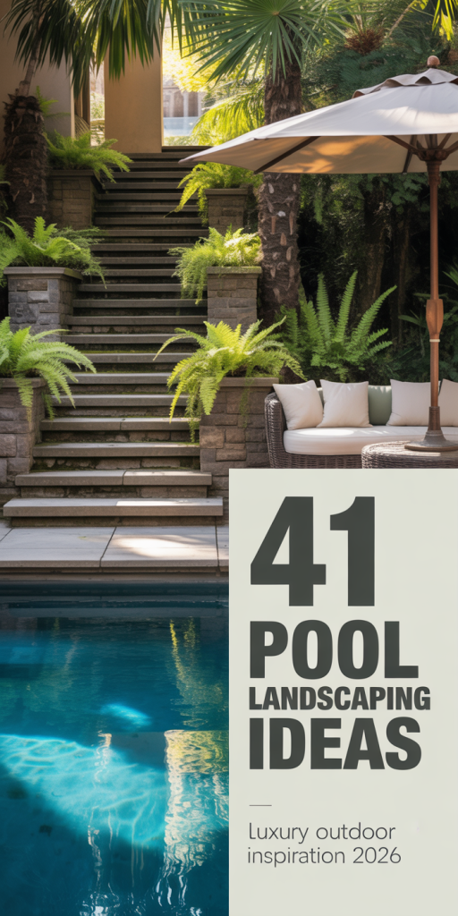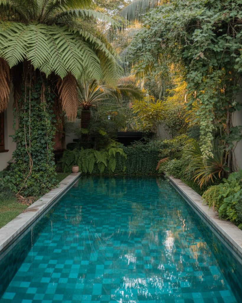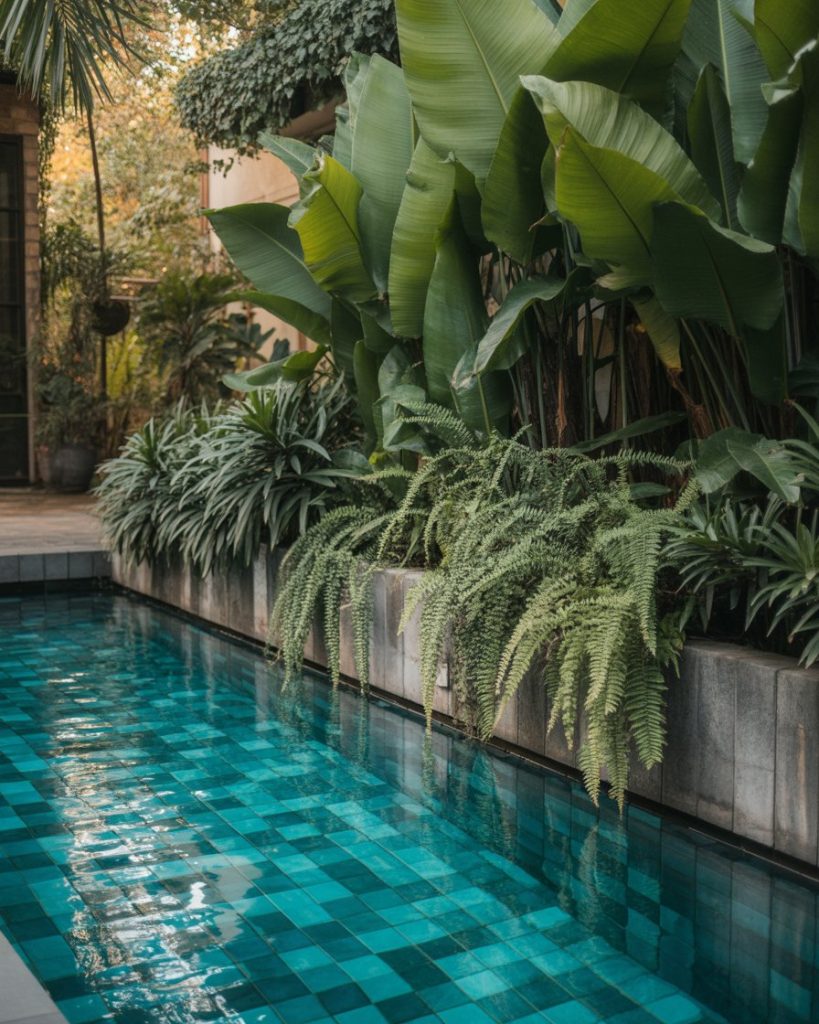 Turn your pool into a green sanctuary. Layer tropical plants, hanging vines, and ground ferns around your swimming area. This natural design cools the air and creates privacy. It’s a favorite idea among those seeking calm, eco-friendly living in their backyard.