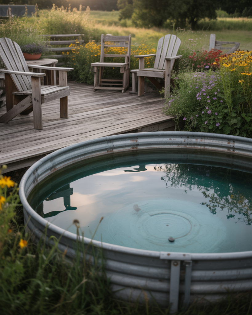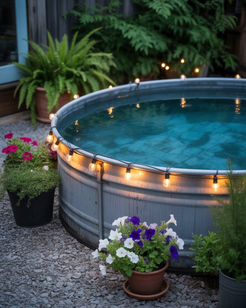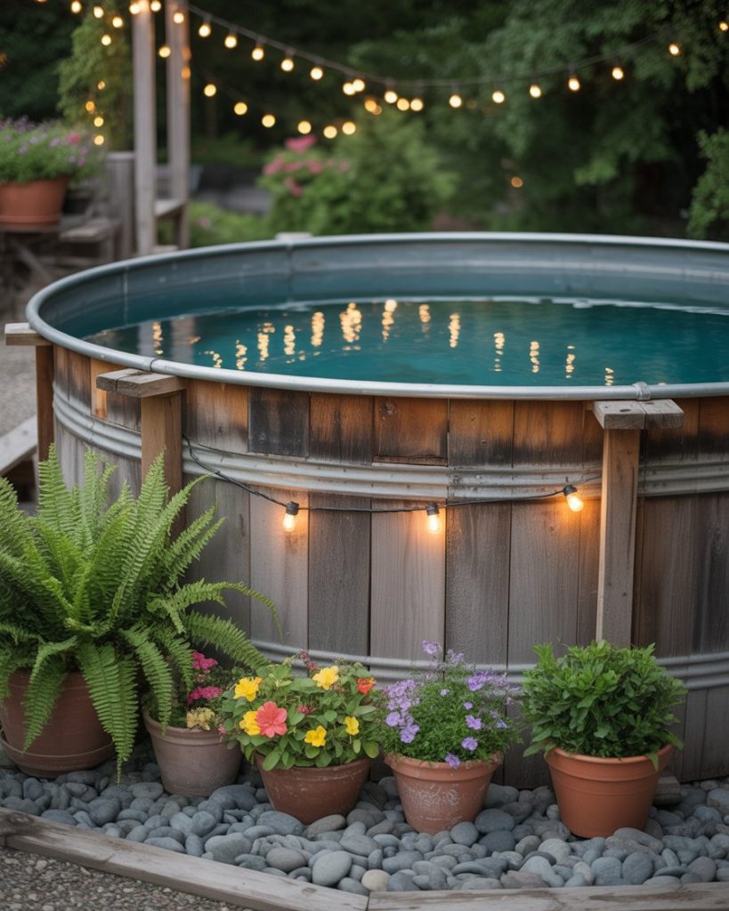 The backyard above ground stock tank pool is a fun, affordable trend sweeping across America. Use gravel ground, potted plants, and string lights around it for a warm, country charm. This design blends simplicity and creativity — perfect for summer lounging without breaking the bank.