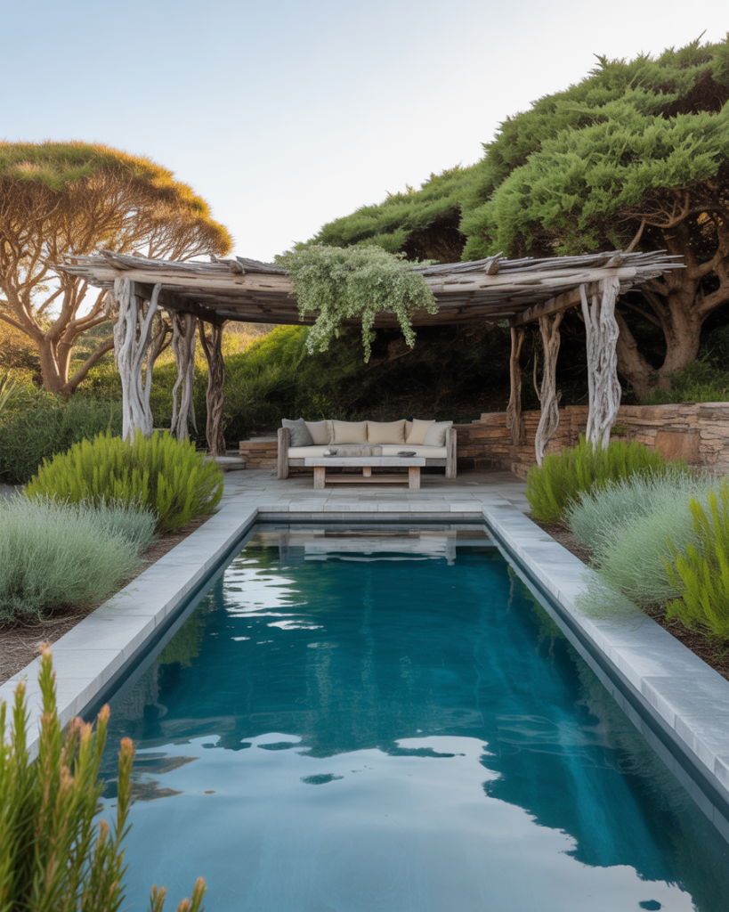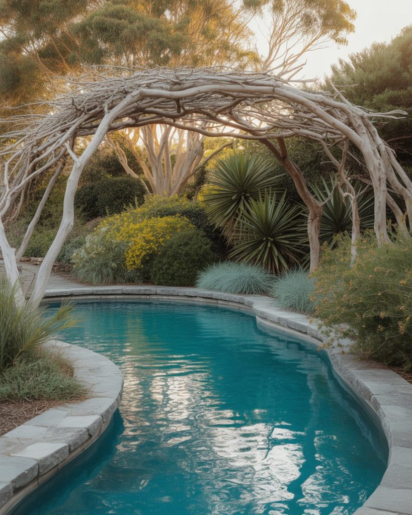 Inspired by Australian coastal homes, this design combines sand-colored tiles, ocean-blue tones, and native plants. Add driftwood accents and a breezy pergola around your swimming area to recreate that seaside feel. It’s a fresh, airy approach that works beautifully for above ground pools too.