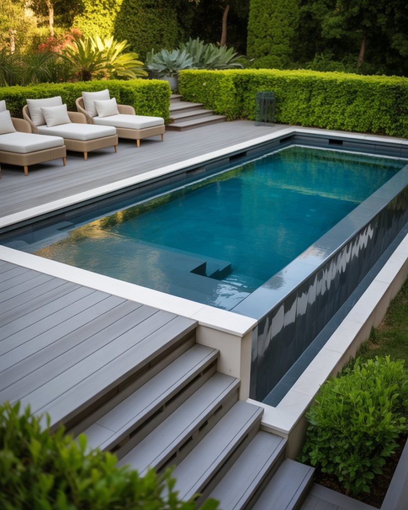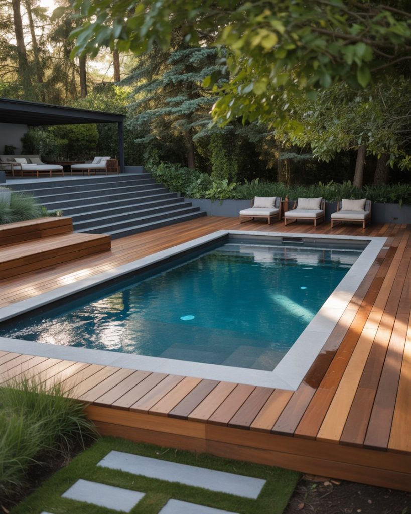 Transform your above ground pool with a raised wooden deck. This design creates a resort-like vibe, blending the pool into the backyard landscape. Add steps, loungers, and decorative plants to complete the scene — one of the most practical design ideas for modern homes.