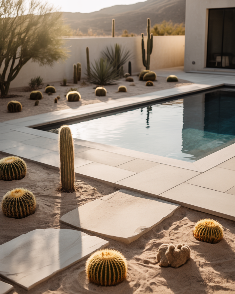 Merge desert beauty and modern design with natural stone, sand, and drought-resistant plants. A small backyard inground pool surrounded by cacti and pebbles offers a timeless, low-water aesthetic. It’s simplicity redefined — warm, durable, and stylish.