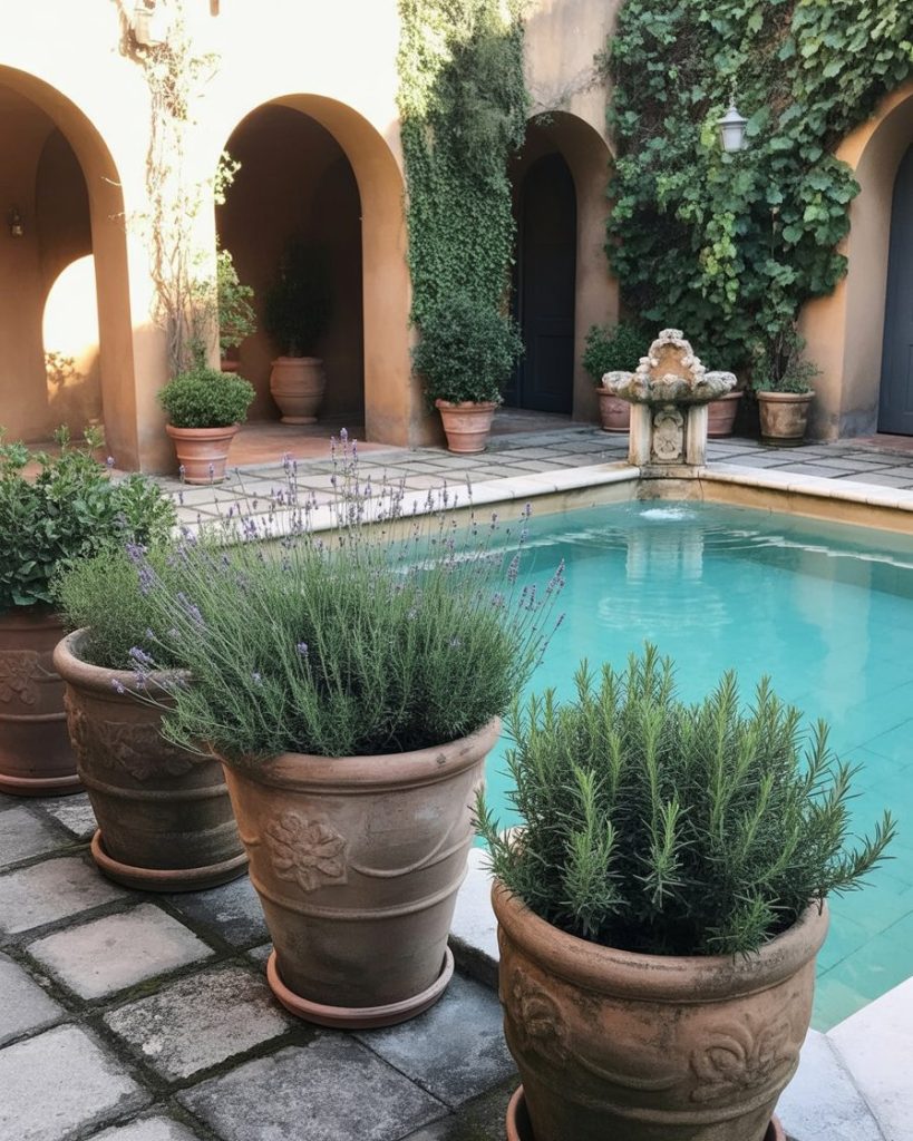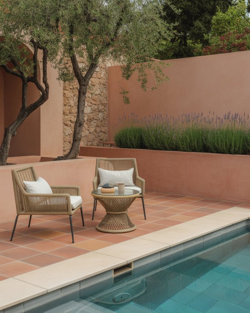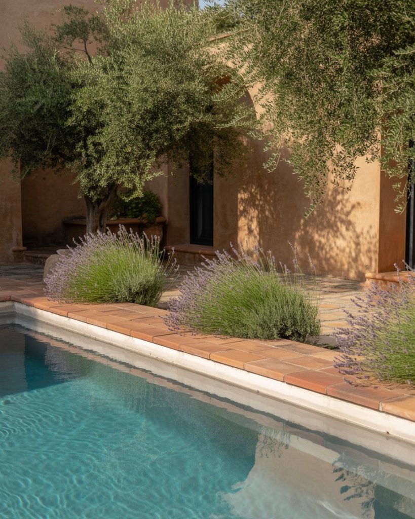 Inspired by the Mediterranean coast, this design features terracotta tiles, stone walls, and olive plants. The look suits both above ground and inground pools. Add lavender for color and scent, creating a timeless, sun-kissed ambiance. Designers at Better Homes & Gardens highlight how this style merges rustic beauty with relaxed sophistication.