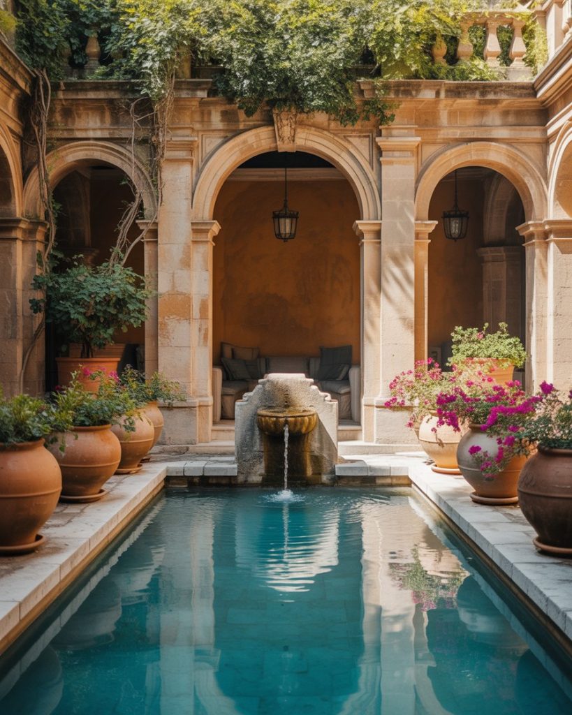 Imagine a private Mediterranean courtyard with arches, clay pots, and climbing vines around your pool. This classic design works well for both above ground and inground setups. Add a rustic fountain and wrought-iron chairs for that European villa charm.