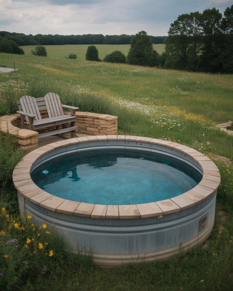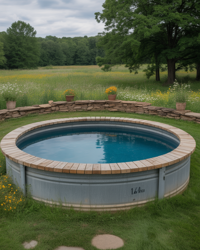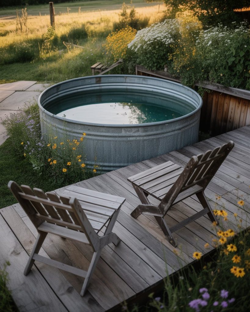 A country pool design blends nostalgia and comfort. Think weathered wood decks, vintage lanterns, and wildflowers around the swimming area. Using a stock tank pool adds rural charm, especially in a small backyard. Rustic design ideas like these make outdoor living inviting and authentic, perfect for those who love cozy farmhouse aesthetics.