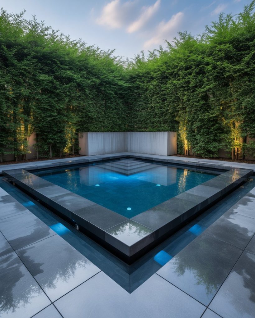 For a striking statement, try a geometric inground design. Sharp lines, square shapes, and polished concrete around the pool create a bold, modern aesthetic. Add LED lights for an evening glow — sleek and sophisticated.