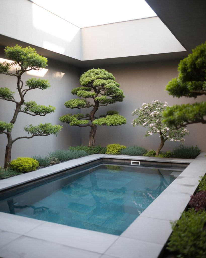 A simple minimalist design focuses on balance and tranquility. Use light stone tiles and clean lines around your inground pool for a calming atmosphere. Add a few sculptural plants or bonsai to complement the serenity. This approach, popular in Mediterranean and Japanese spaces, turns your backyard into a peaceful retreat where less truly feels like more.