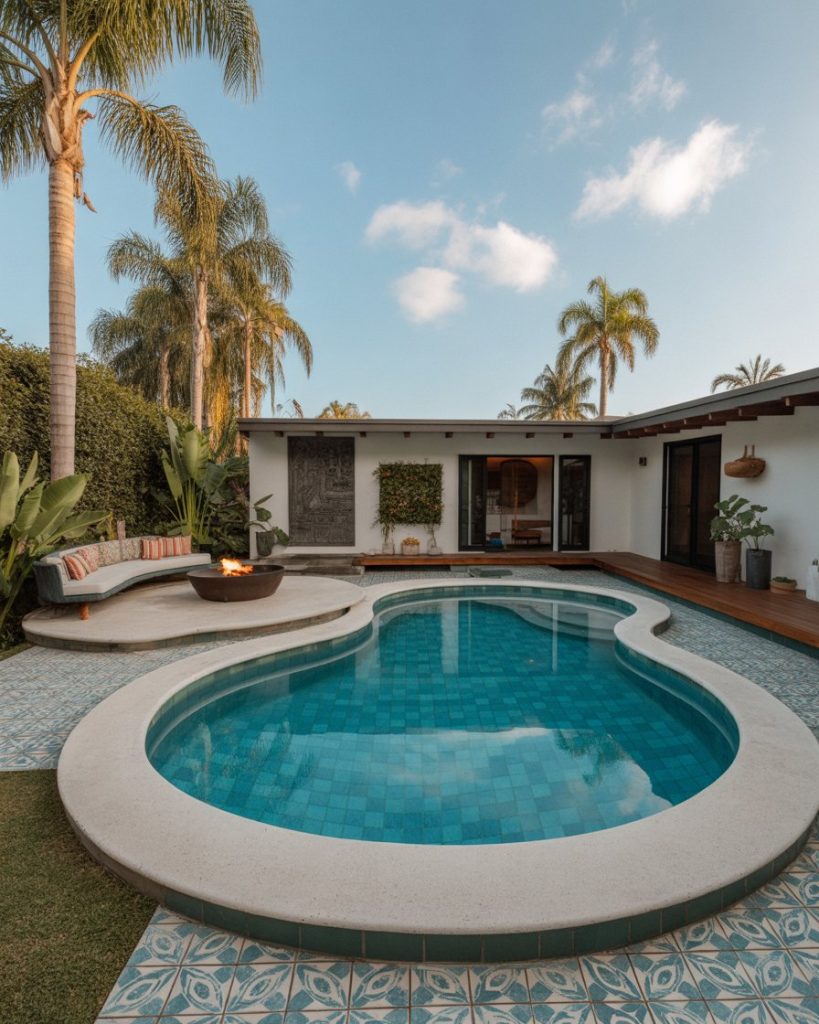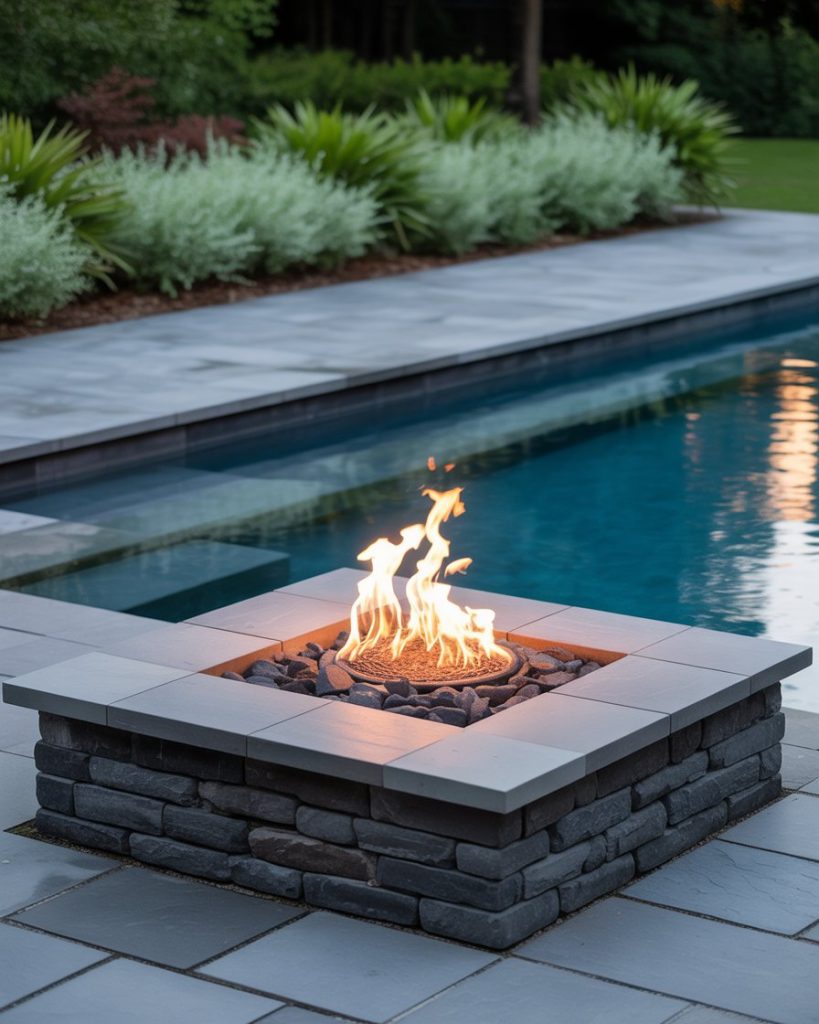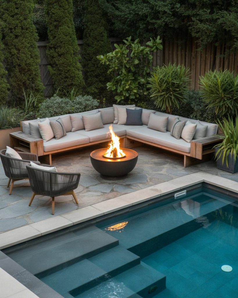 Combine fire and water for dramatic contrast. A fire pit around your pool adds warmth and ambiance, creating an unforgettable backyard design. Pair it with simple plants and natural stone for balance. This style merges elegance with elemental energy.