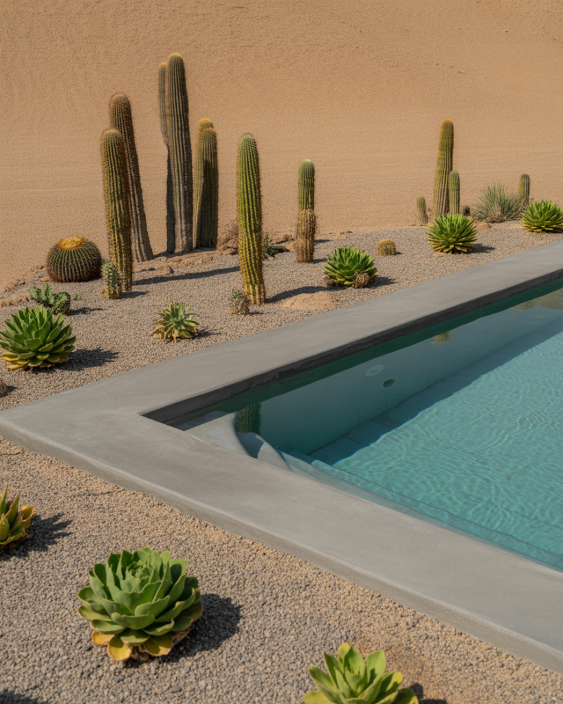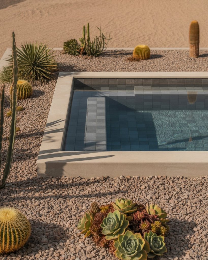A desert-themed design is perfect for dry regions. Use gravel ground, cacti, and succulents around your Intex or plunge pool for a bold, modern aesthetic. This low-maintenance look pairs well with Australian architecture and mid-century influences, offering both beauty and practicality under the sun.