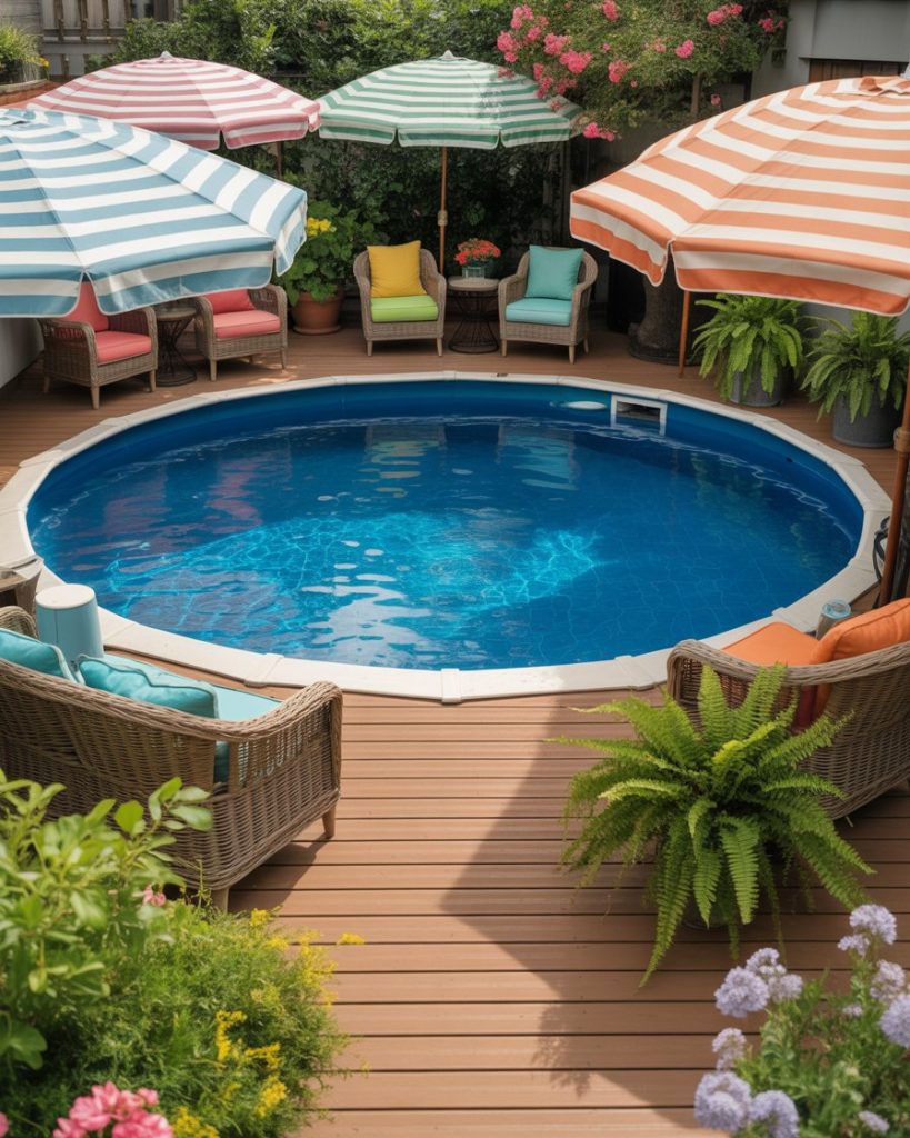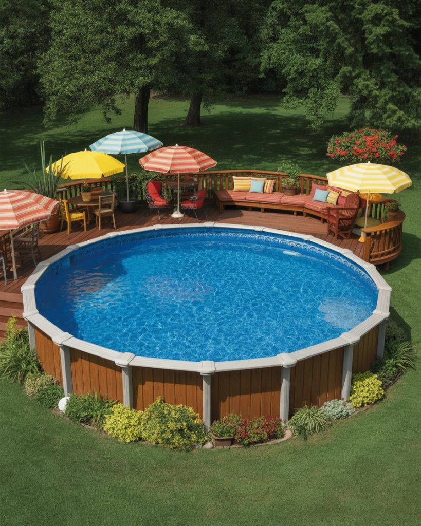 A round above ground pool adds joy and function to any backyard. Use wooden decking around the pool and layers of plants for a natural transition to the landscape. Add colorful umbrellas for playful contrast. With thoughtful design above ground, this setup becomes as elegant as any traditional pool.